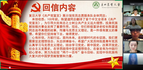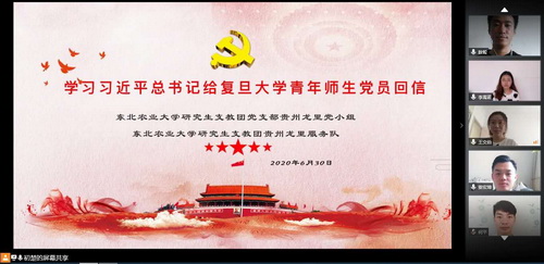 近日习近平总书记给复旦大学《共产党宣言》展示馆党员志愿服务队全体队员回信,勉励他们继续讲好关于理想信念的故事,并对全国广大党员特别是青年党员提出殷切期望。东农研究生支教团党支部全体党员备受鼓舞,7月1日研支团党支部7个党小组纷纷以省外服务地集中学习和省内线上云端学习形式,认真学习回信精神,观看新闻联播报道和学校庆祝建党99周年暨“先优”表彰专题片,纷纷表示将向党员先进典型学习,在学思践悟中坚定理想信念,在奋发有为中践行初心使命,走好新时代的长征路,为学校高水平农业大学和世界一流学科建设贡献力量。