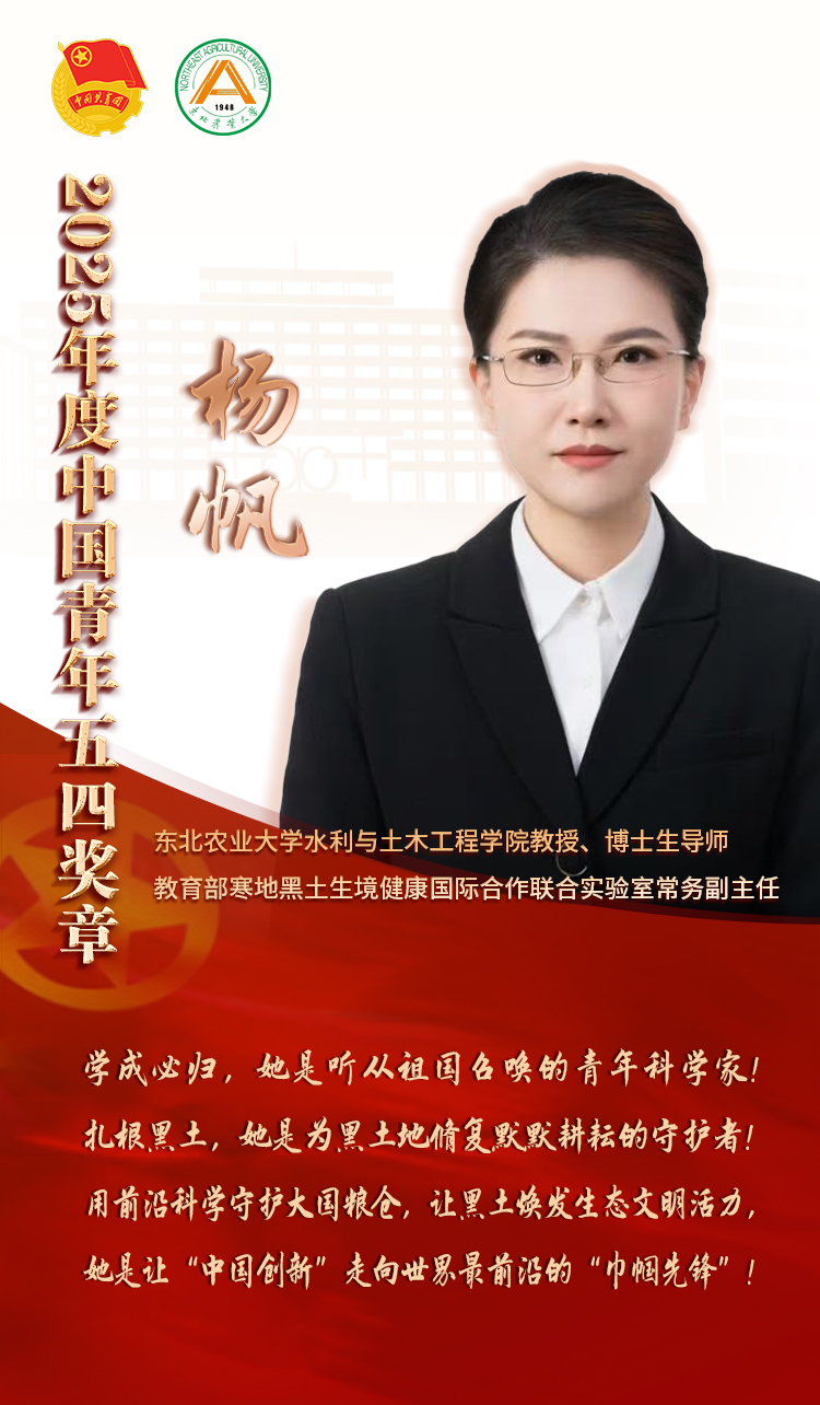 共青团中央给杨帆的颁奖词是:“学成必归,她是听从祖国召唤的青年科学家!扎根黑土,她是为黑土地修复默默耕耘的守护者!用前沿科学守护大国粮仓,让黑土焕发生态文明活力,她是让“中国创新”走向世界最前沿的“巾帼先锋”!”