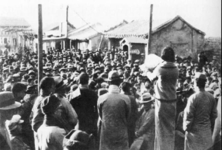图为清华大学女学生陆璀(持话筒者)在北平西直门外进行抗日宣传