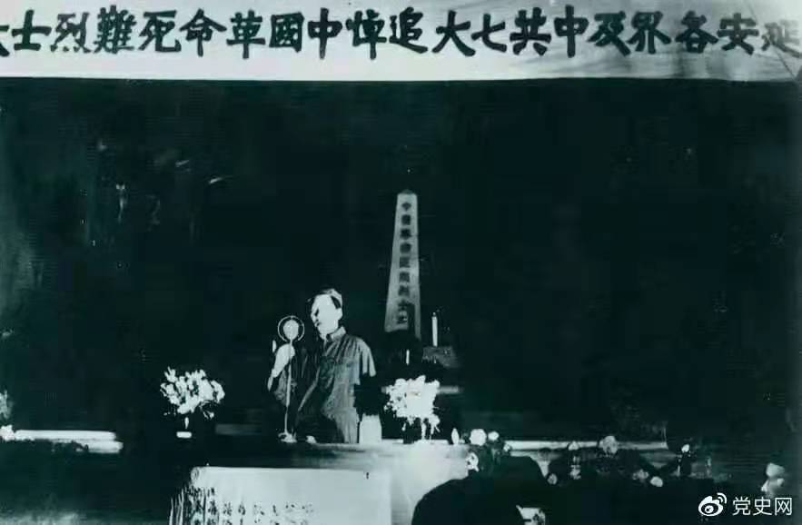 1945年6月17日,中共七大代表及延安各界代表在中央党校大礼堂,举行中国革命死难烈士追悼大会。图为毛泽东致悼词。
