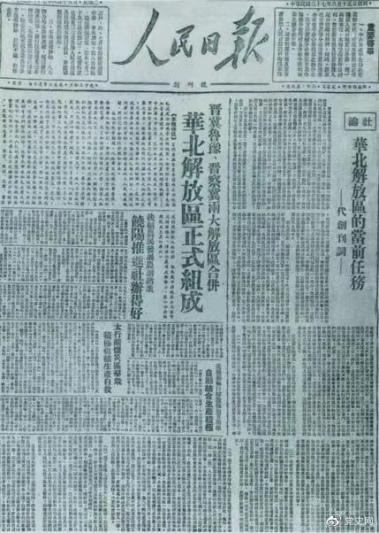 1948年6月15日,晋冀鲁豫解放区《人民日报》与《晋察冀日报》合并后出版的《人民日报》创刊号。