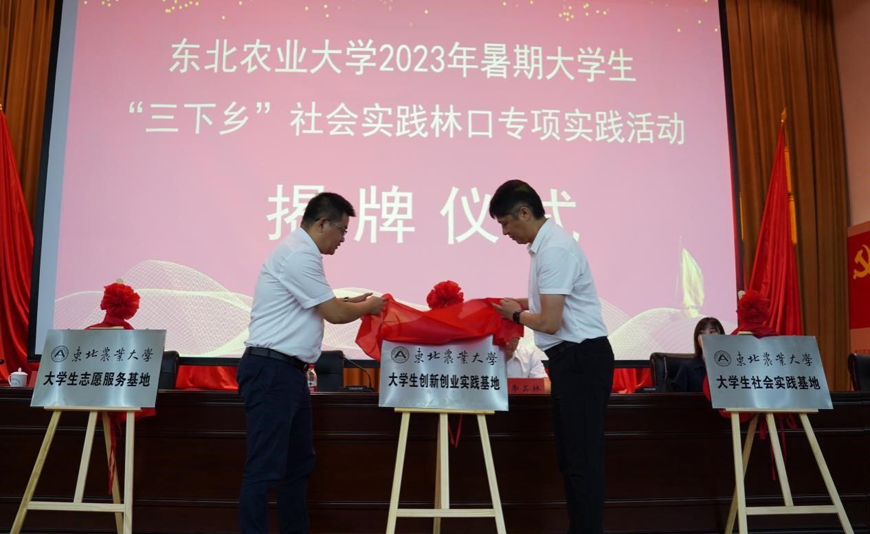 启动会上,校团委书记李卡和林口县委常委、组织部长艾磊为大学生创新创业实践基地、大学生社会实践基地、大学生志愿服务基地揭牌。