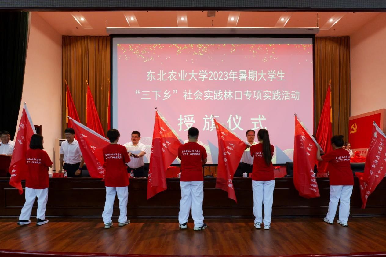 与会领导共同为 2023 年暑期大学生“三下乡”社会实践林口专项实践活动团队代表授旗。