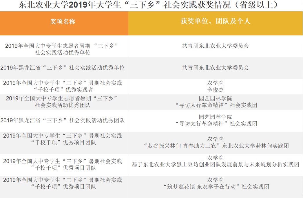 园艺园林学院“寻访太行革命精神”社会实践团荣获“2019年全国大中专学生志愿者暑期‘三下乡’社会实践活动优秀团队”、“2019年黑龙江省‘三下乡’社会实践活动优秀团队”两项荣誉称号。在2019年全国大中专学生志愿者暑期“三下乡”社会实践“千校千项”成果遴选活中,我校农学院“菽谷振兴林甸 青春助力三农,赴林甸实践团”、“基于东北农业大学黑土豆坊创业团队发展前景与未来规划分析实践团”、“筑梦莲花镇东农学子在行动社会实践团”荣获“2019年全国大中专学生“三下乡”暑期社会实践“千校千项”优秀项目团队”,农学院辛俊杰同学荣获“2019年全国大中专学生‘三下乡’暑期社会实践“千校千项”优秀实践者”荣誉称号,我校社会实践获奖数量位居我省高校首位。