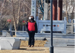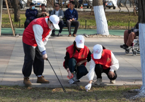 青年志愿者在后稷园进行校园绿地保护值岗和景观建筑清洁