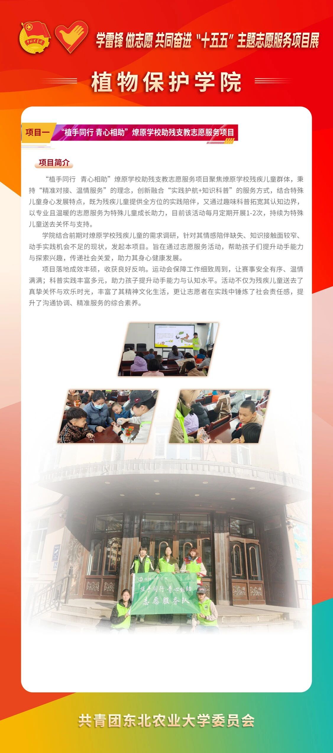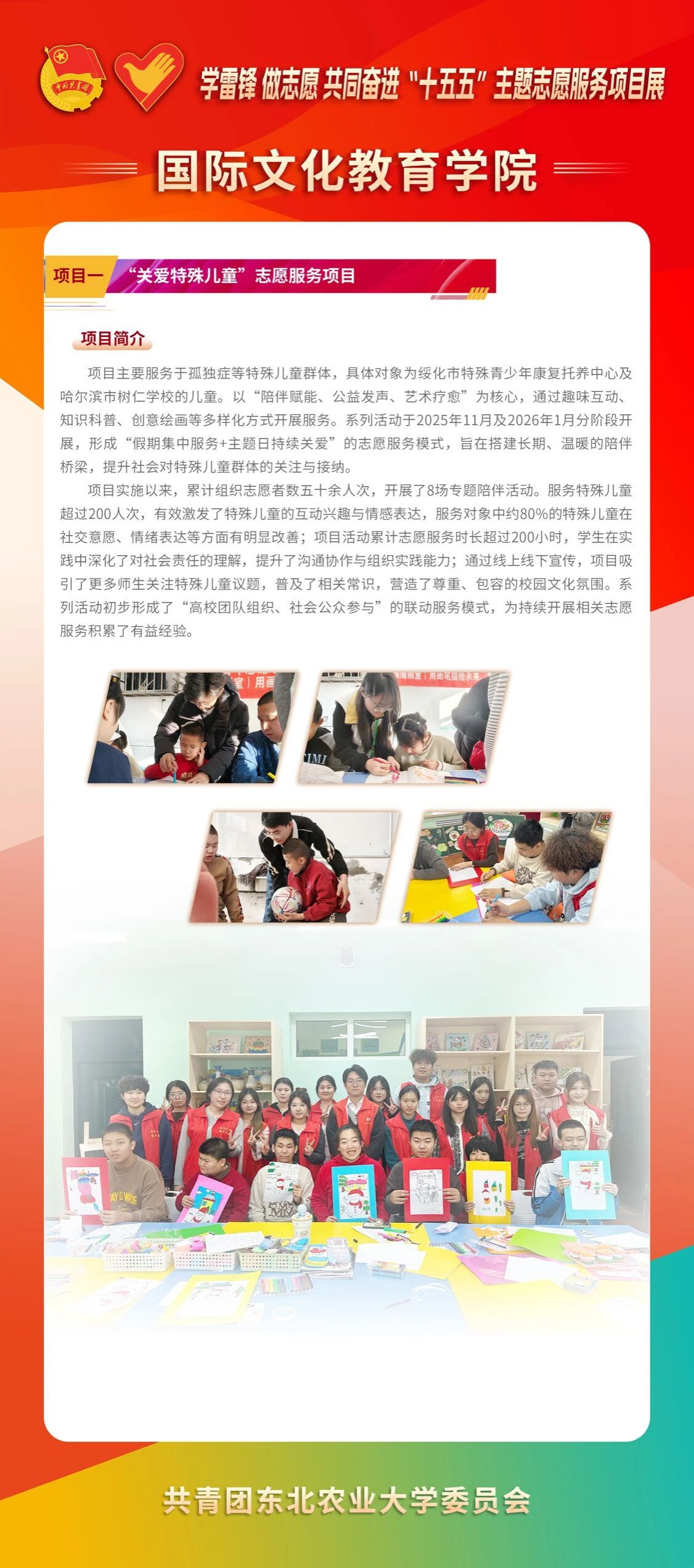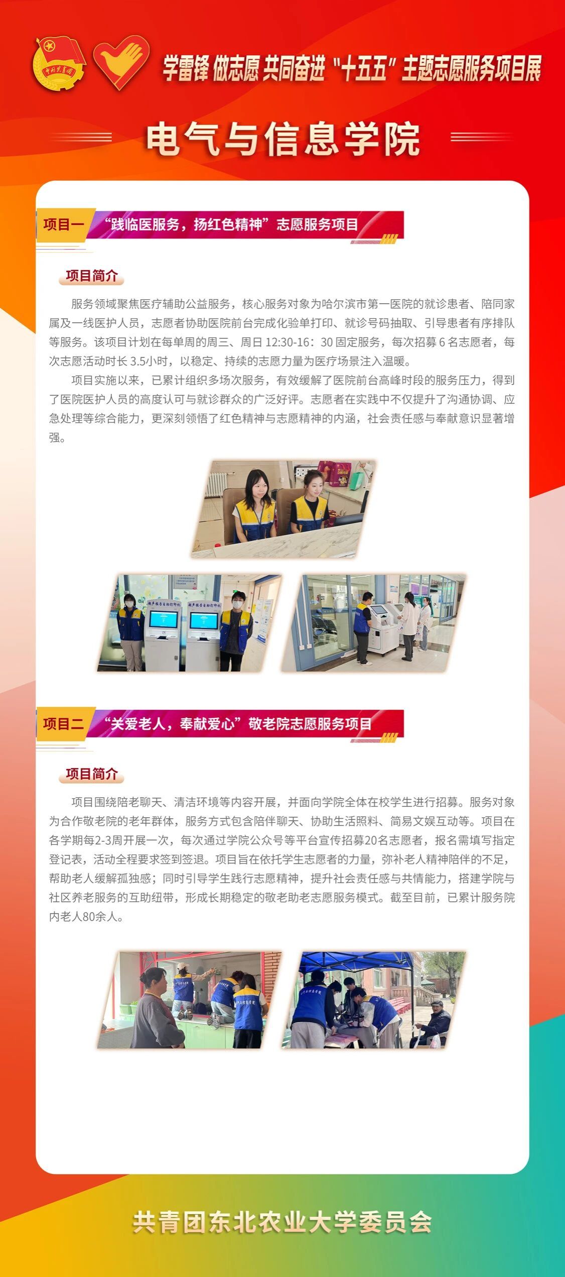 为深入学习贯彻党的二十届四中全会精神和习近平总书记致中国志愿服务联合会第三届会员代表大会重要贺信精神,全面落实立德树人根本任务,大力弘扬雷锋精神及“奉献、友爱、互助、进步”的志愿服务精神,引导我校青年在服务国家战略、百姓民生、社会治理中彰显青春担当,推动学雷锋志愿服务精准化、专业化、品牌化、常态化,各学院紧扣学科优势与社会需求,深耕打造一批特色鲜明、成效突出的品牌志愿服务项目,以志愿实践凝聚青年力量、强化使命担当。