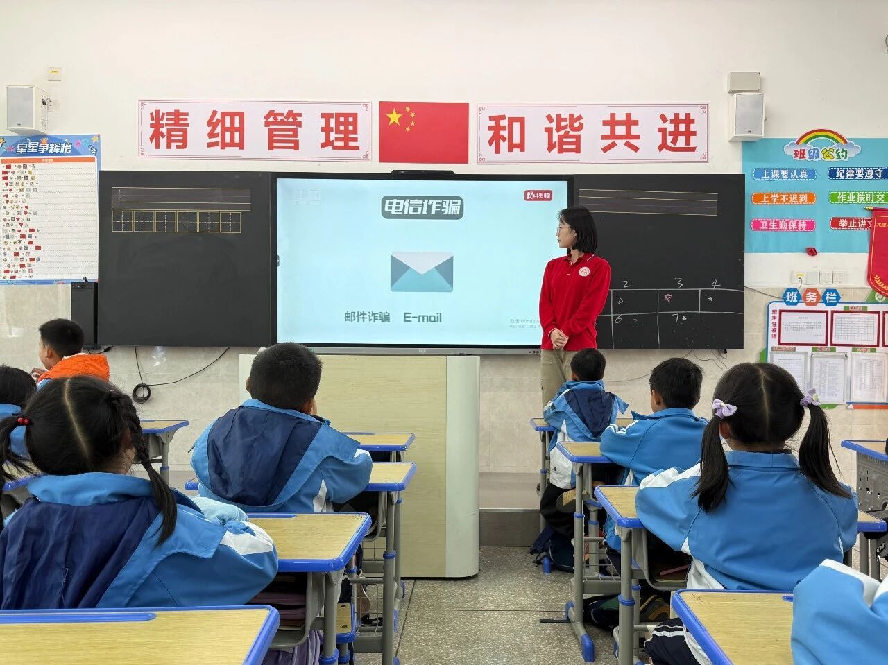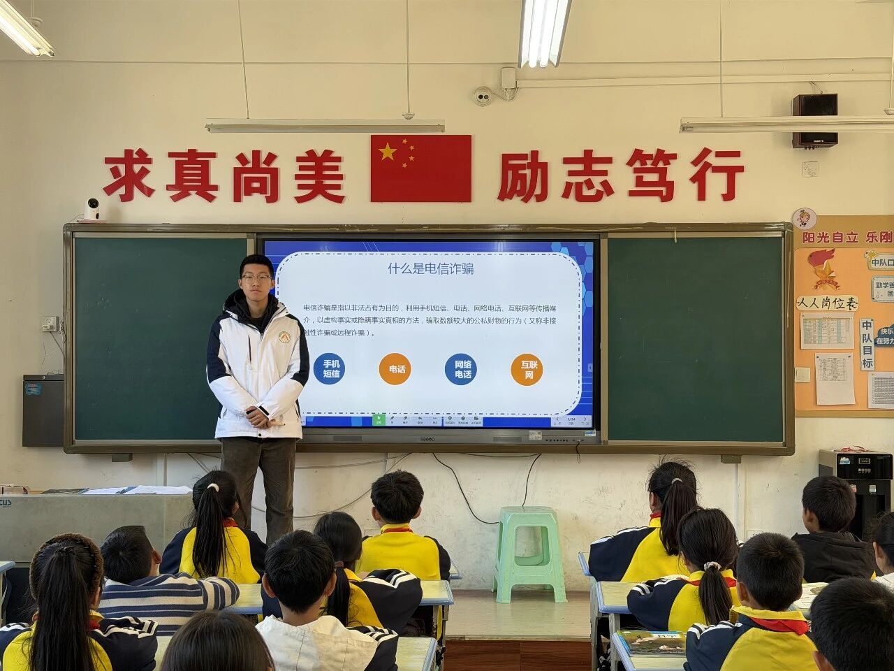 在宣讲环节,支教团志愿者结合中小学生认知规律,针对未成年人网络使用频繁、防范意识薄弱、易被游戏返利、冒充师长等骗局诱导的特点,把专业法律知识与防骗技巧转化为通俗易懂、好记实用的课堂内容。以主题班会、互动课堂为载体,通过案例剖析、趣味问答、风险场景拆解等形式,引导同学们牢记“不轻信、不透露、不转账、遇困先找家长老师”的核心准则,手把手教会大家识别诈骗套路、掌握求助与止损方法。