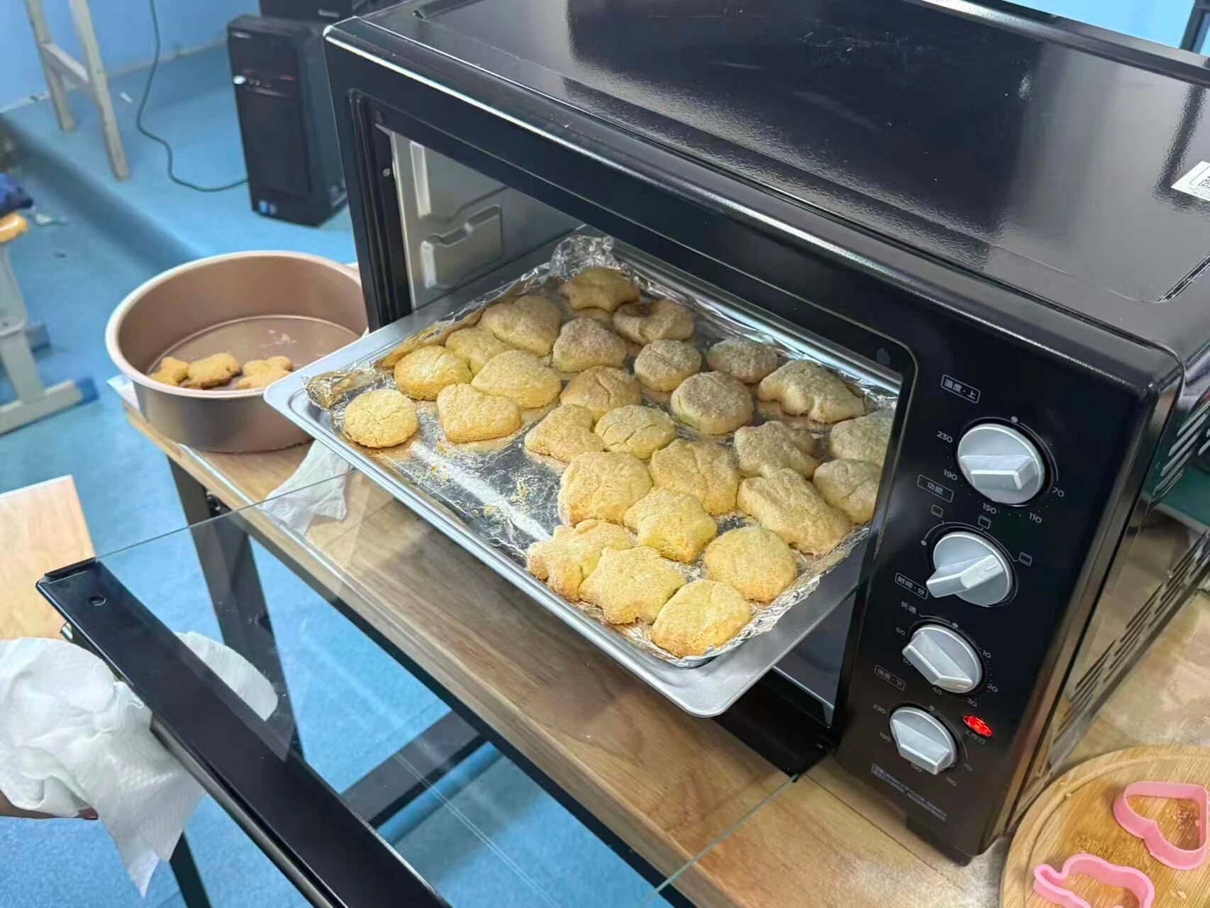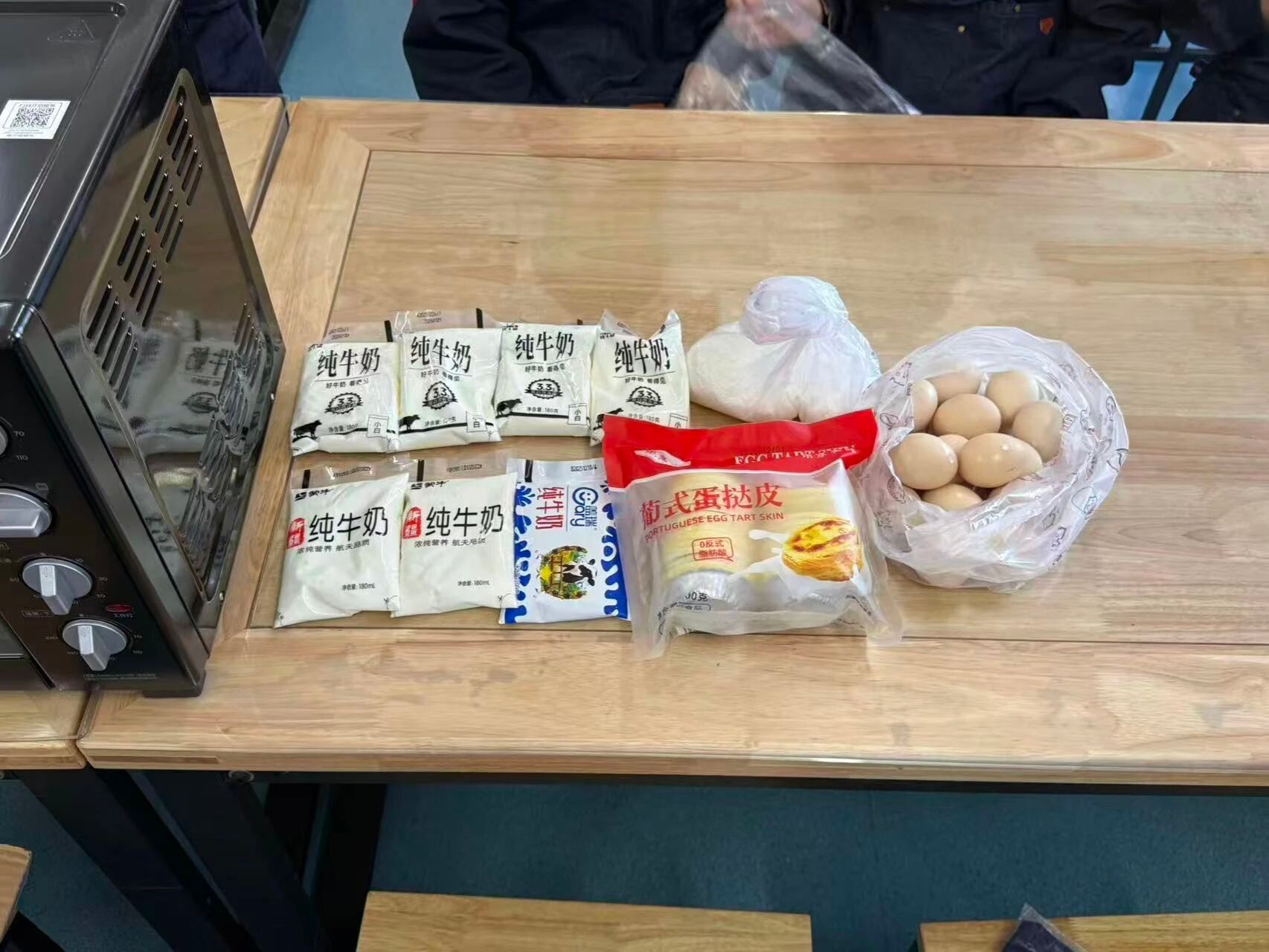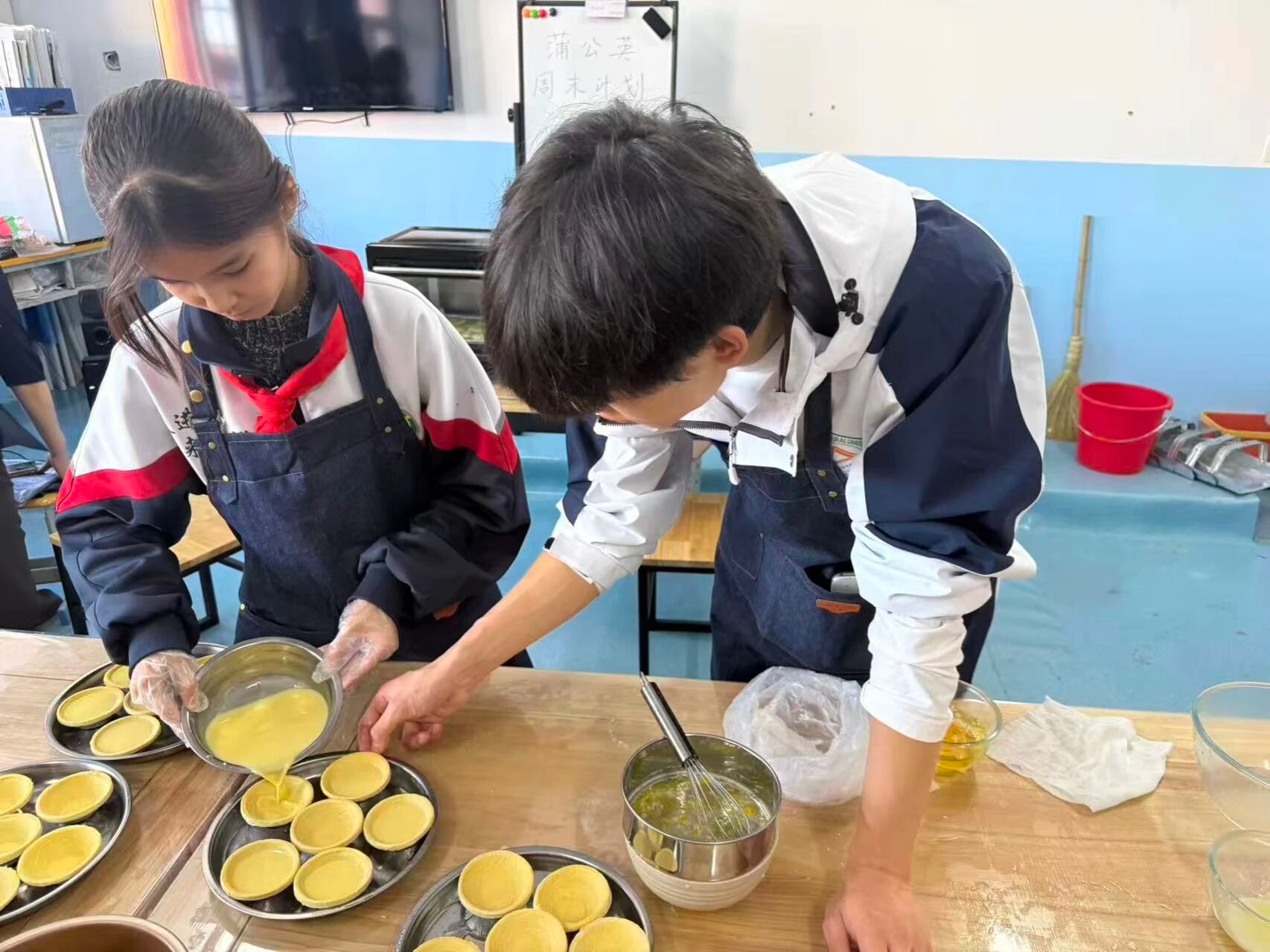 活动当天,研支团成员提前规划活动流程,采购新鲜食材、调试烘焙设备。准备工作完成后,研支团成员向学生详细讲解蛋挞液调制比例、饼干面团揉制技巧及烤箱安全操作规范,用通俗易懂的语言拆解步骤难点,确保学生理解操作要点。