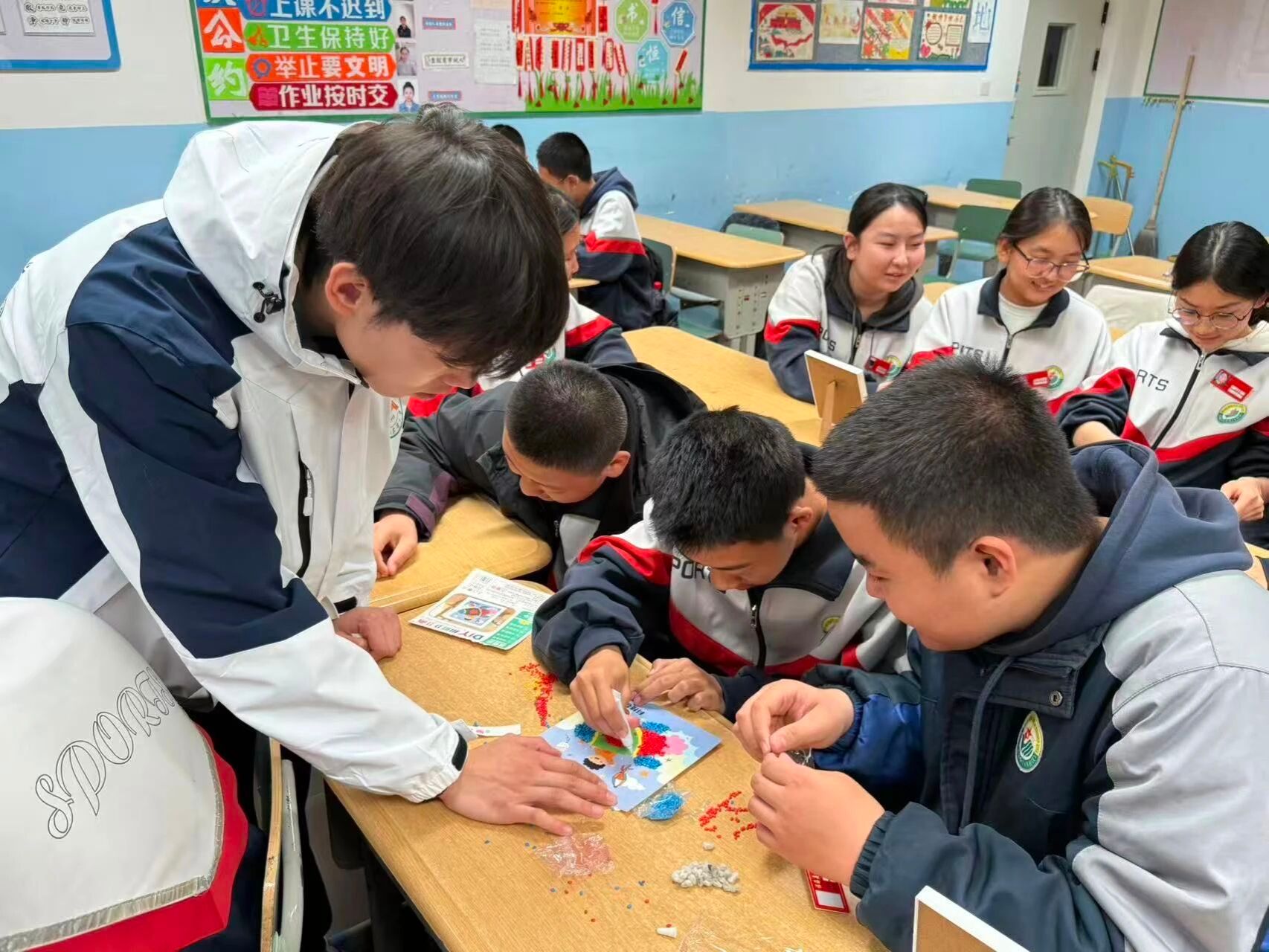 理论学习结束后,课堂进入实践环节。研支团成员为各小组分发不同种类的作物种子、画纸、胶水等材料,鼓励学生以“民族团结”“丰收景象”等为主题展开创作。学生们分工协作、相互配合,在动手实践中进一步深化对“地域文化交融”的理解,将理论认知转化为具象创作。