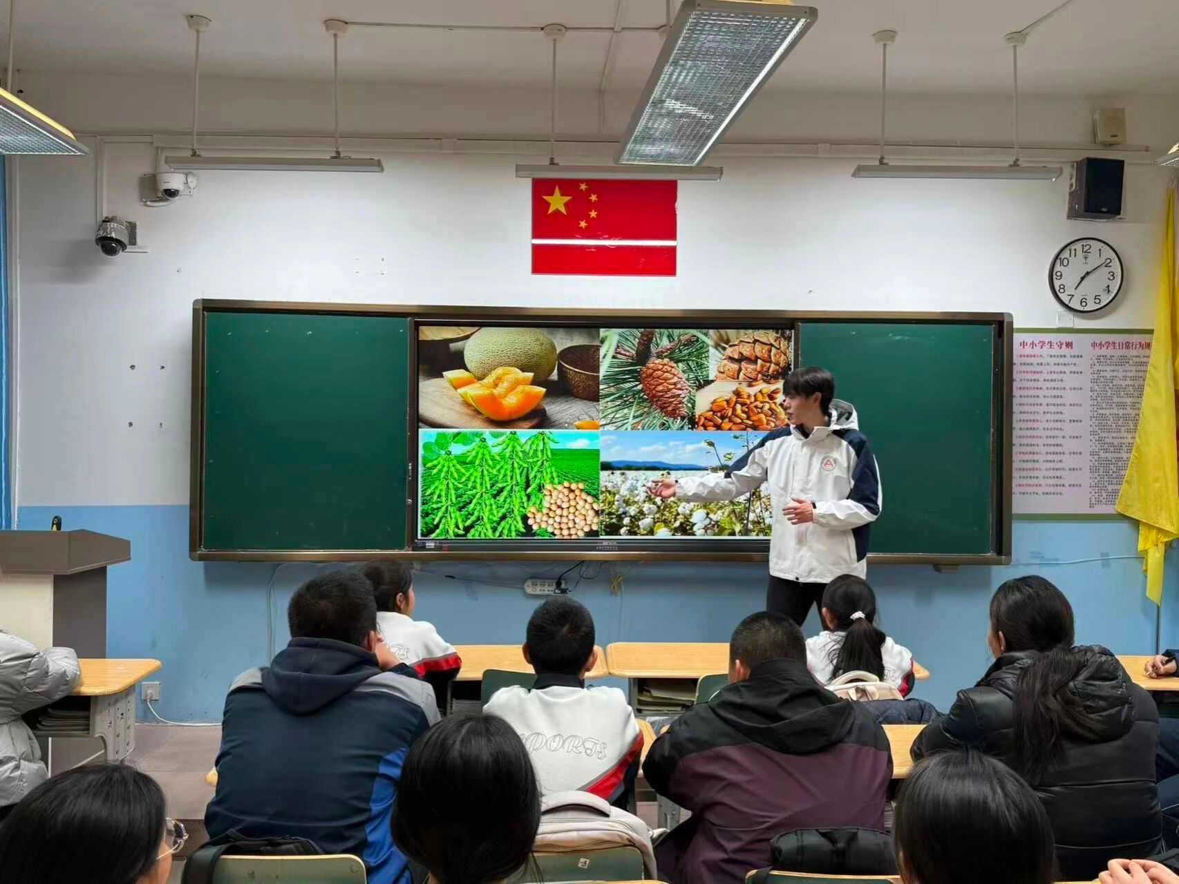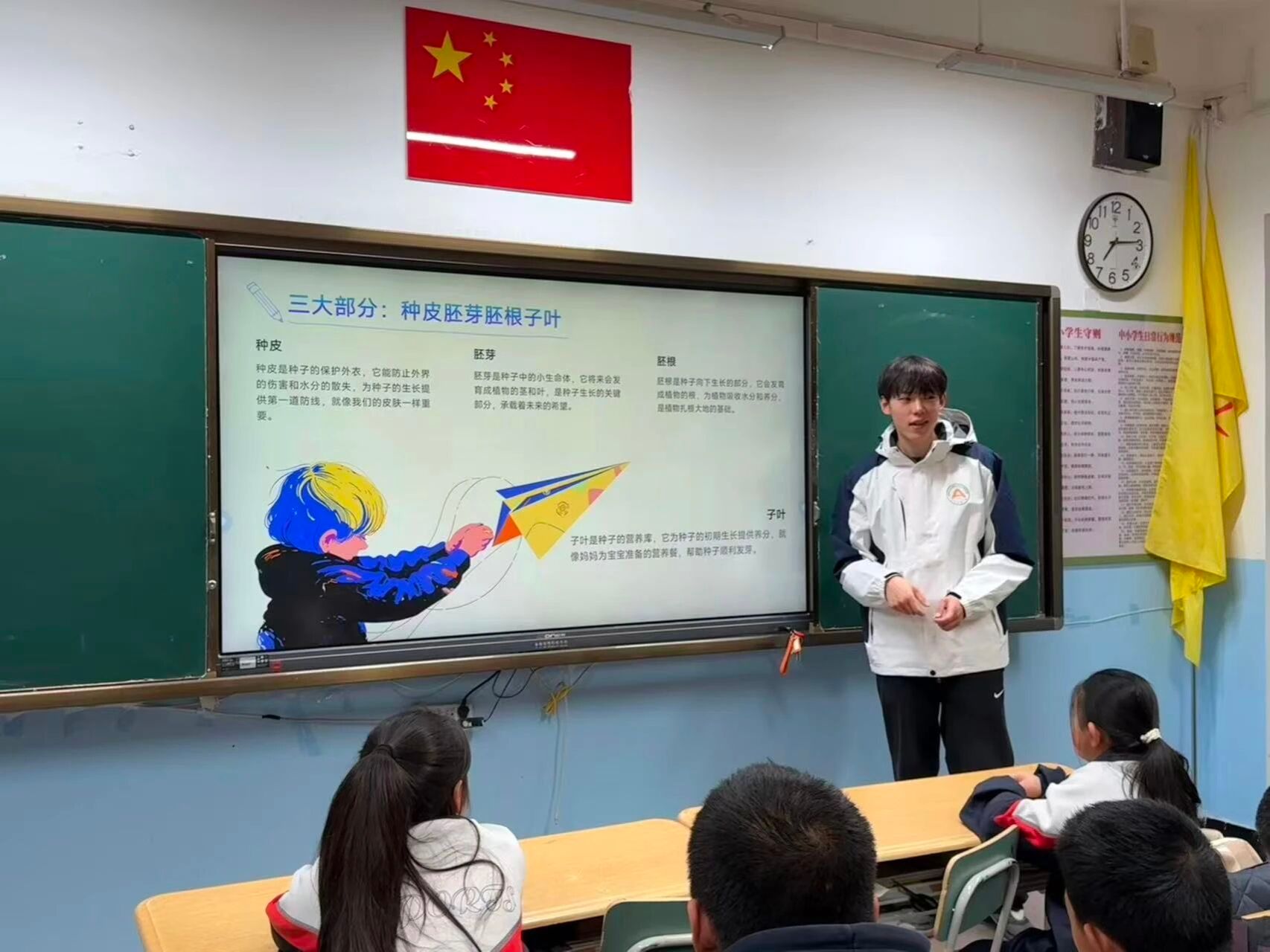 课堂伊始,研支团成员以“地域作物与种子对比”为核心,将实物展示与农业科普相结合,带领学生认识特色作物种子。通过介绍哈密瓜籽、西瓜籽、棉花籽、大豆籽、松子等形态特征,让学生直观感知两地作物种子的差异与关联,进一步理解不同地域农业文化的独特价值。在认识种子的基础上,成员借助解剖模型与动画演示,清晰拆解种子的种皮、胚根、胚芽等基本结构,并结合实例逐一说明功能——如种皮的保护作用、胚根发育成根的过程等,帮助学生建立科学认知体系,深化对种子生命特性的理解。