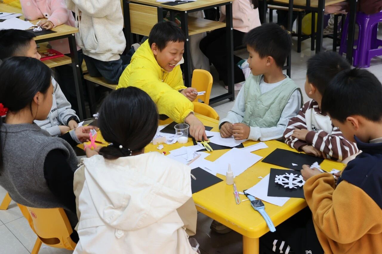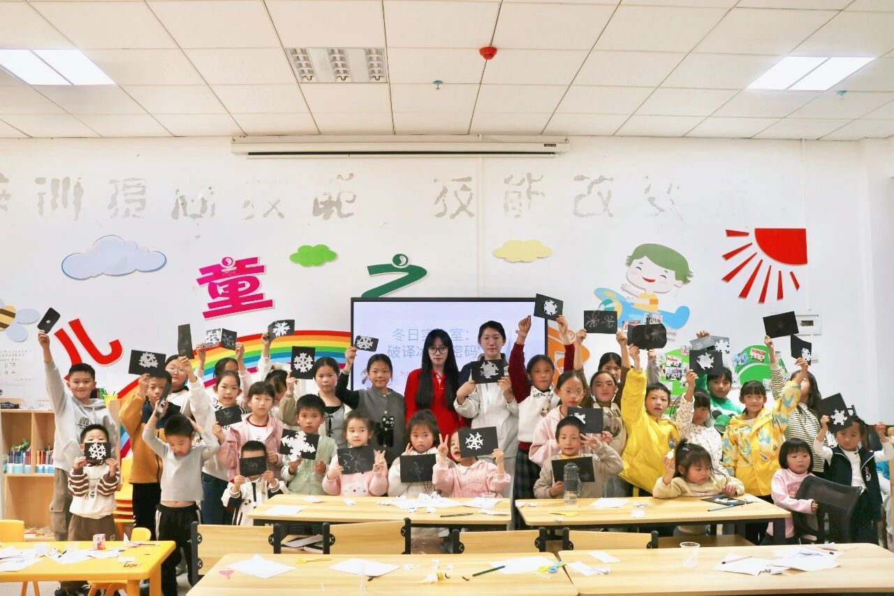 实验环节,成员金宇含和聂长萍带领孩子们沉浸式体验两项趣味实验。在“会开花的雪花”制作中,孩子们手持精心剪裁的雪花卡纸,轻轻用小喷壶将水喷洒在纸面上,原本合拢的雪花图案缓缓绽放,孩子们发出阵阵惊叹与欢呼。随后的“盐水雪花”实验里,孩子们调配盐水、绘制雪花,观察水分蒸发后盐晶体凝结成雪花状的奇妙过程,成员用童趣语言揭秘结晶原理,让抽象的科学知识变得通俗易懂。实验过程中,孩子们大胆尝试,在动手实践中锻炼了观察力与创造力。