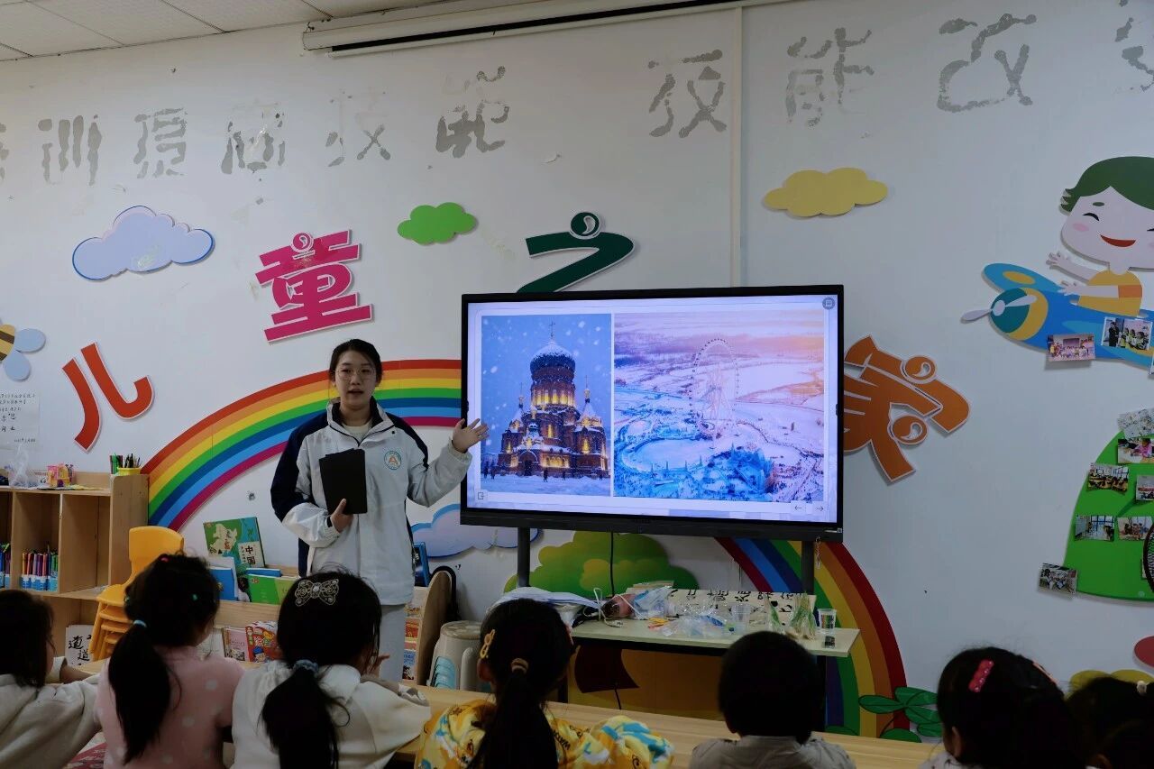 活动伊始,支教团成员金宇含以家乡哈尔滨的冰雪文化为切入点,用生动的语言讲述了冰雪大世界的奇幻景观、冰雪节的热闹氛围。从冰雪雕塑的创意巧思到冰雪运动的热血激情,孩子们心中种下对冰雪世界的向往。互动问答环节中,“世界上到底有没有两片一模一样的雪花?”“冰雕如何长久保存?”等问题引发孩子们踊跃抢答,在互动中进一步加深了对冰雪知识的记忆。