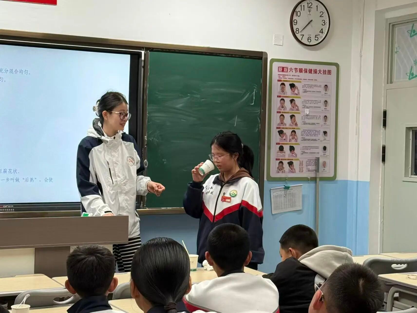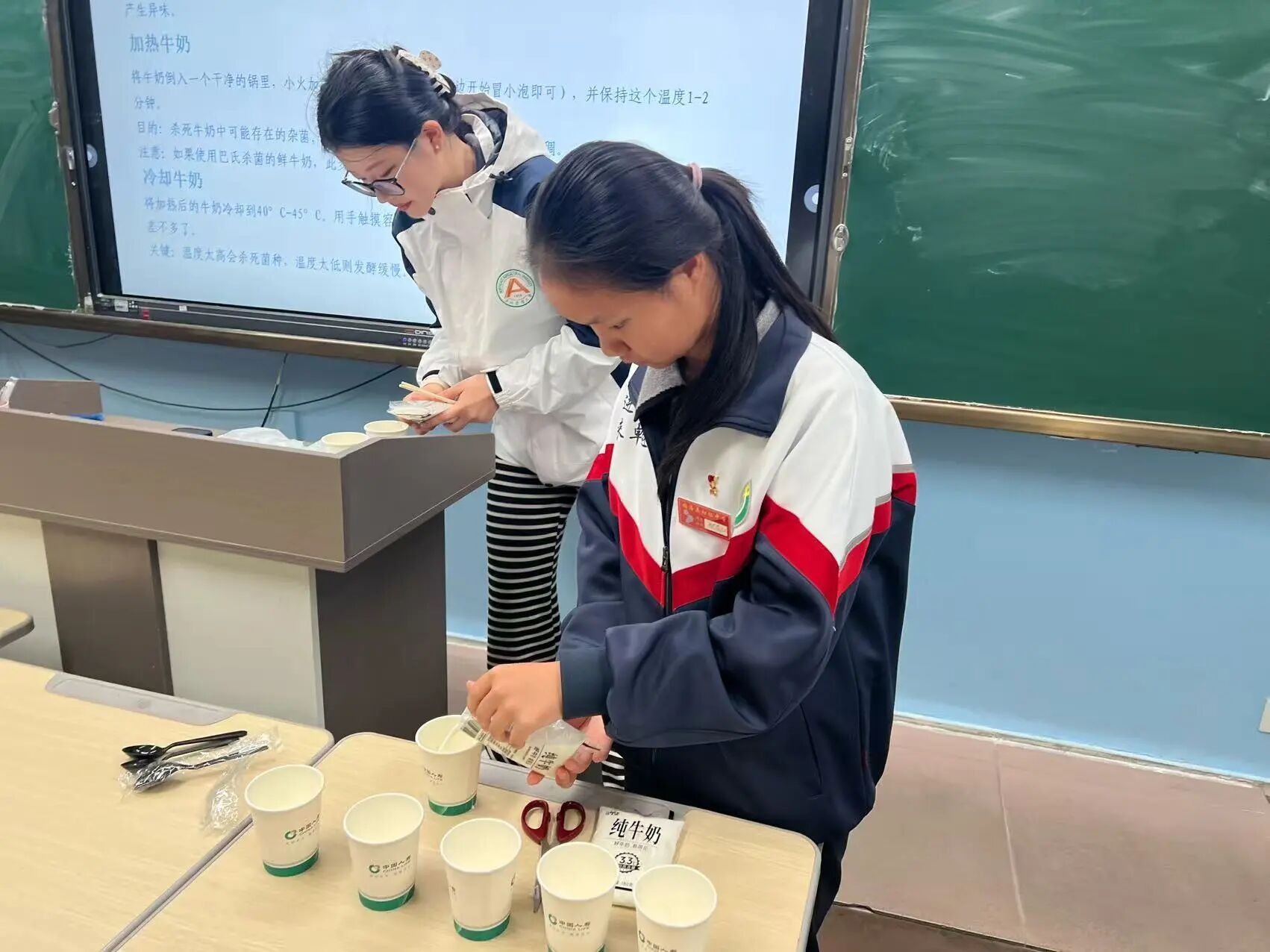 理论讲解后,课程转入实践操作环节。研支团成员通过动画演示,拆解酸奶发酵的核心步骤,并分组指导学生开展自制酸奶实验。学生互相协作完成酸奶制作,直观感受科学知识的实际应用。
