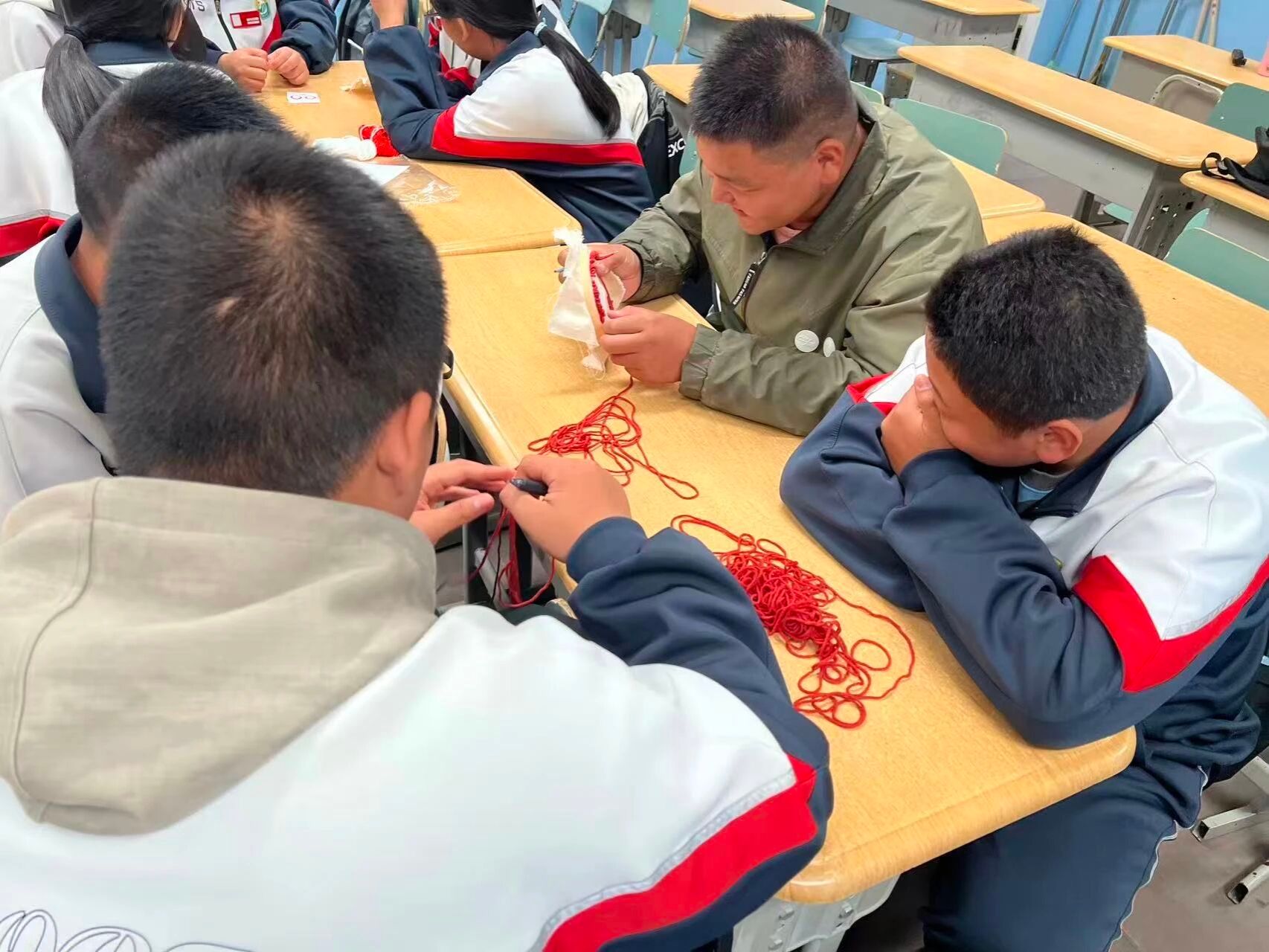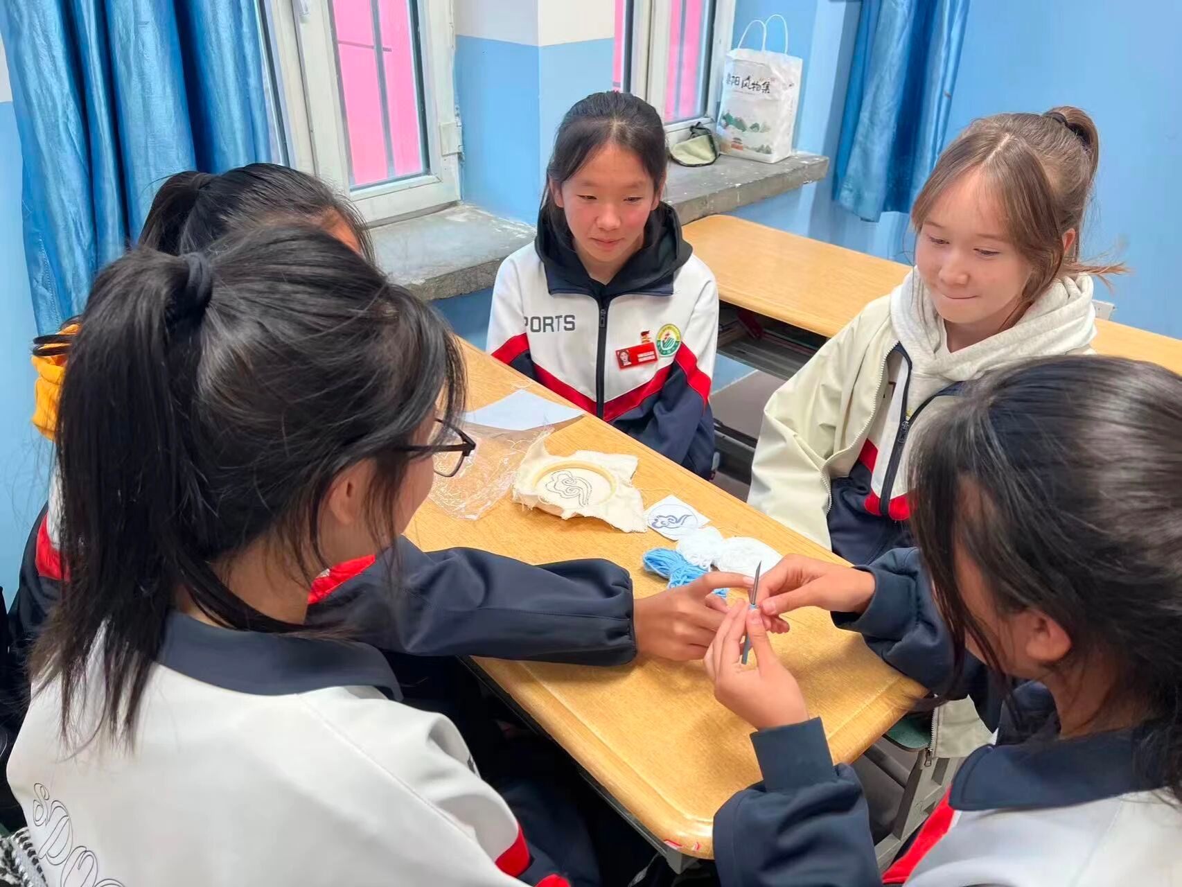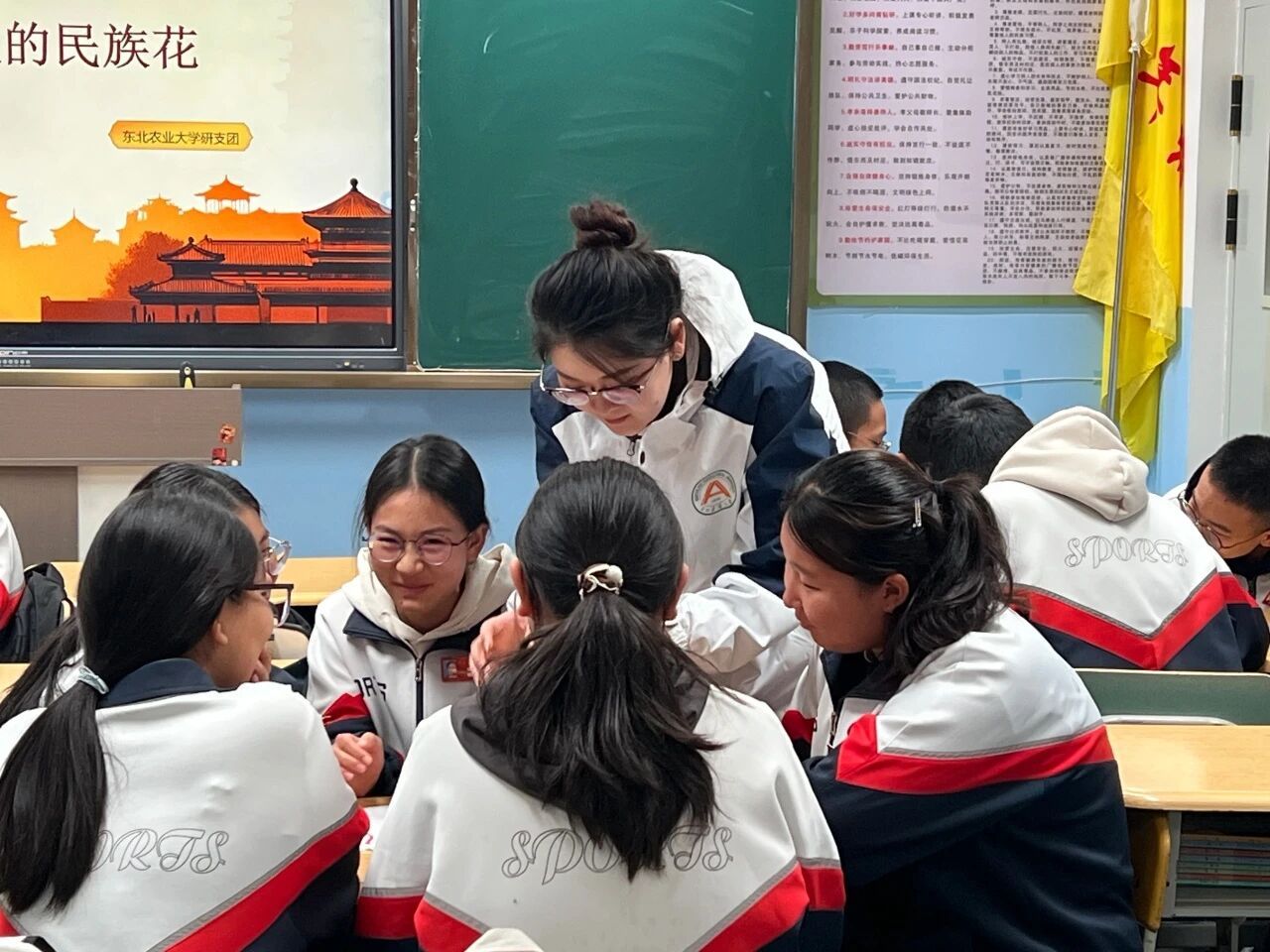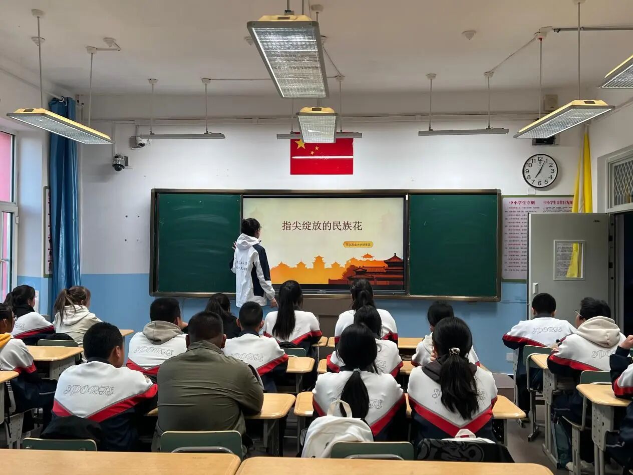 为深化民族团结教育,增强新疆青少年对中华文化的认同,铸牢中华民族共同体意识。近日,东北农业大学第十二届研究生支教团新疆福海服务队面向福海县初级中学的同学,开展“石榴籽课堂”系列特色课第二期——《指尖绽放的民族花》。