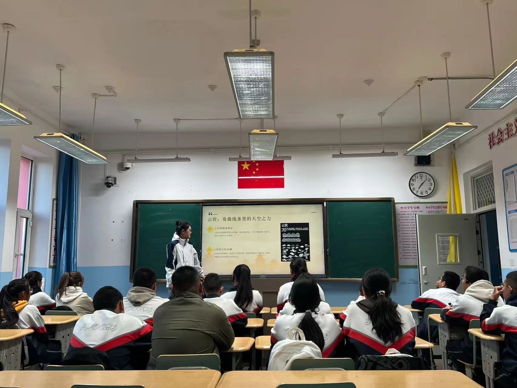 本次课程以“民族纹样”为核心教学内容,研支团成员从地域文化切入,系统讲解多个经典民族纹样的文化内涵—哈萨克族的羊角纹、鹰翅纹尽显游牧风情,满族的云纹寄托美好祈愿,蒙古族的哈木尔纹镌刻草原记忆,引导同学们认识民族纹样的文化价值,进一步树立起保护、传承民族文化的自觉意识。
