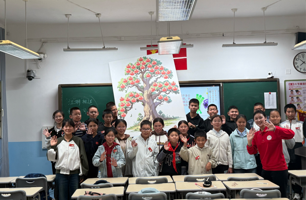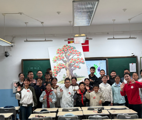 课程尾声,支教团成员结合石榴生动阐释“石榴籽紧密相依,恰似各民族同胞同心同行”的深刻寓意。随后组织学生在石榴贴纸上写下心愿,粘贴至“石榴树”背景板完成集体创作。这棵由一张张心愿贴组成的“石榴树”,在学生心中绘就了一幅由情感与认同联结的中华民族共同体情感地图。