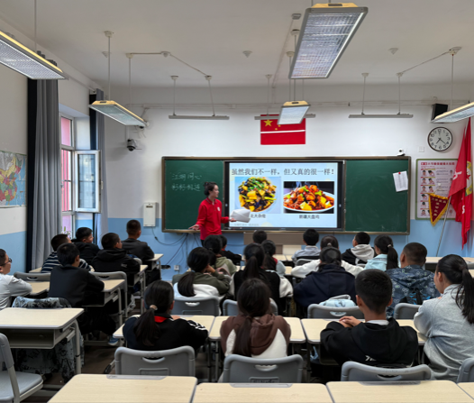 互动环节中,支教团成员以民俗文化为切入点,为同学们介绍东北二人转、新疆麦西来甫的歌舞特色以及东北铁锅炖、新疆手抓肉的饮食风味,引导学生从文化差异中看见更深层的联系。在对不同地域文化的探讨中,让学生感受多元文化魅力,将“尊重差异、包容互鉴”的理念于互动中自然传递。