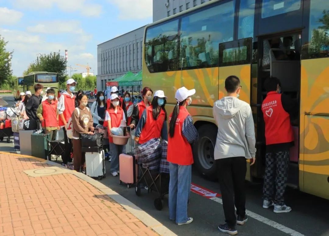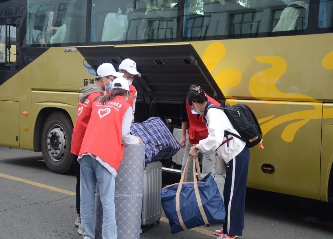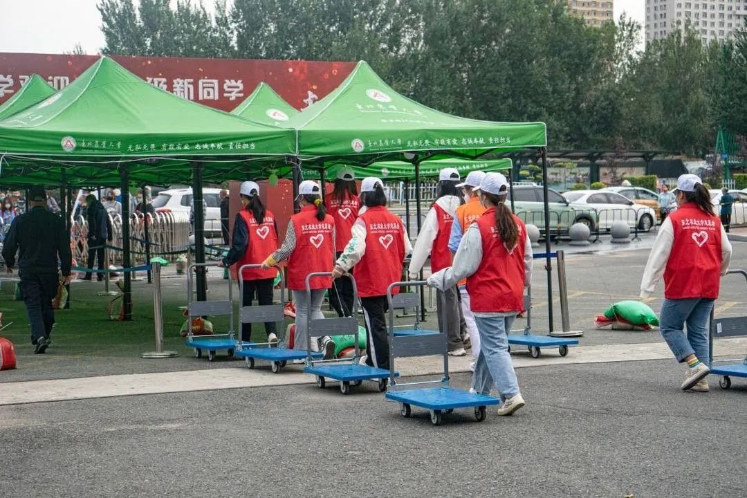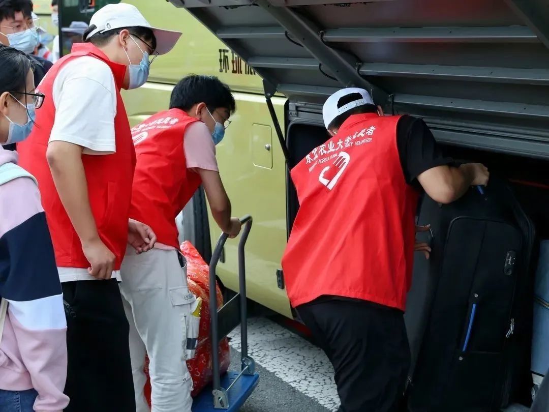 新生进入校园后,负责引导接待工作的志愿者利用提前准备好的推车协助新生将行李转运至大巴车处,由搬运志愿者帮助运入大巴车行李舱。