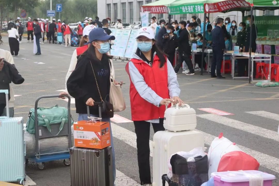 转运大巴车将新生送至南北区各迎新站点,随车志愿者随即负责搬卸行李,并引领新生至各学院所设签到地点。近两日,气温较低,但志愿者们却始终用饱满的热情迎接新同学的到来,他们真诚奉献,主动担当,为新生提供了高效、热情的服务,让学生暖心、家长放心。