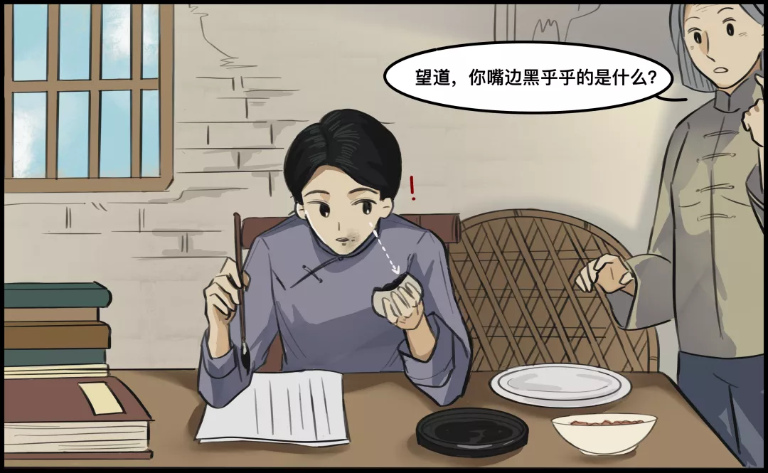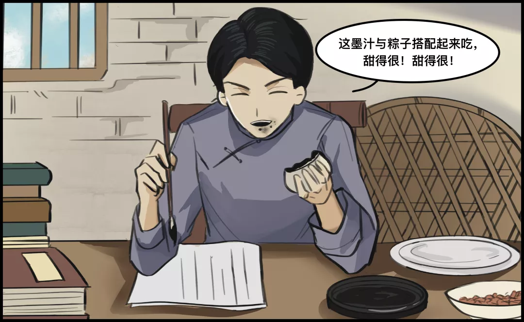 故事的主人公陈望道是我国著名的思想家、语言文学家,亦是在五四新文化运动中发挥重要推动作用的共产党人。1920年2月,陈望道以回乡过春节的名义,在“柴房书屋”里潜心翻译《共产党宣言》。陈望道在家乡小村庄的一间柴房中进行翻译工作。陈望道全部注意力都放在怎样翻译好眼前的《共产党宣言》。一天,他的母亲为他送来热腾腾的粽子,还为他端上一碟红糖汁。可谁知当母亲再次回柴房收拾碗碟时,却发现陈望道桌上的红糖汁丝毫未动,一直被他当做蘸料的,是用来写字的黑墨汁。母亲问他嘴边黑乎乎的是什么,他这才反应过来,却又笑盈盈对母亲说:“这粽子配墨汁,甜得很!”