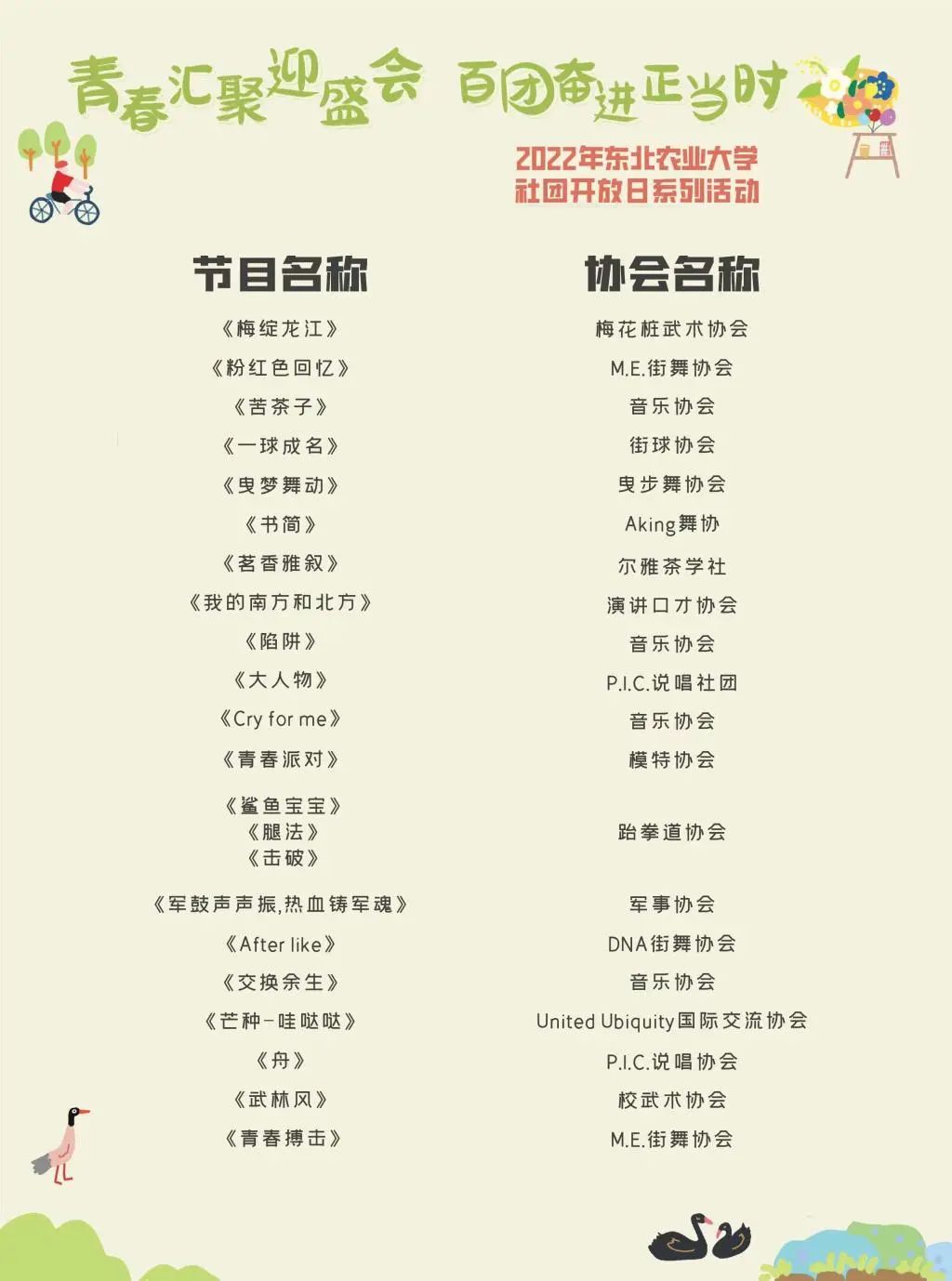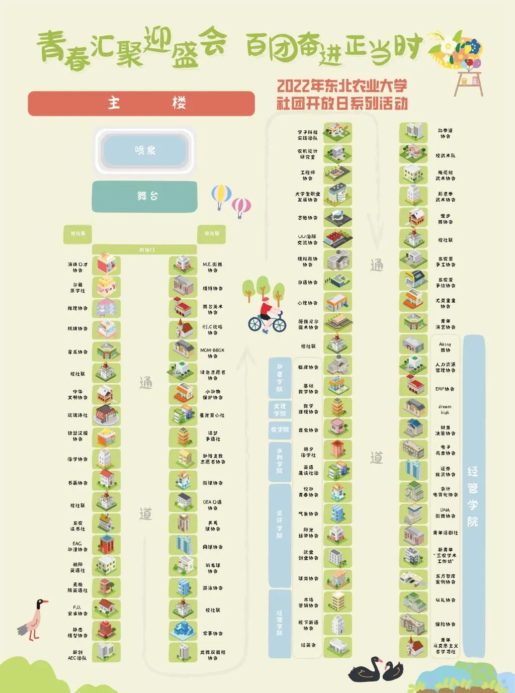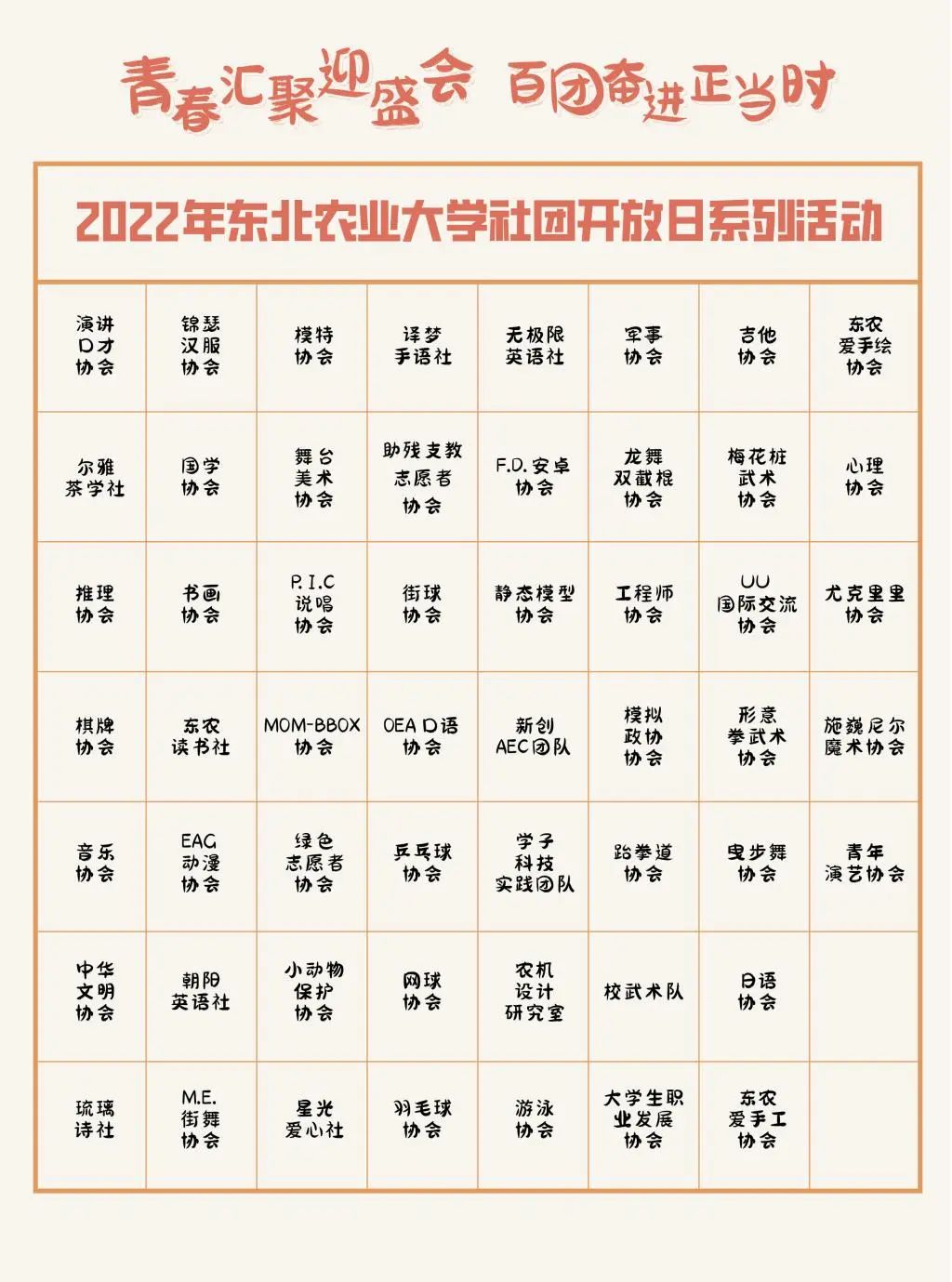 百花齐放、丰富绮丽的学生社团汇聚了东农校园文化的青春力量。为深入贯彻落实“共青团切实增强思想政治引领实效”的工作要求,促进学生社团更好培养同学兴趣特长,丰富学生文化生活,提高学生综合素质,引领青年学生坚定理想信念,为迎接党的二十大营造良好氛围,校团委特举办“青春汇聚迎盛会,百团奋进正当时”社团开放日活动。现就相关安排通知如下。