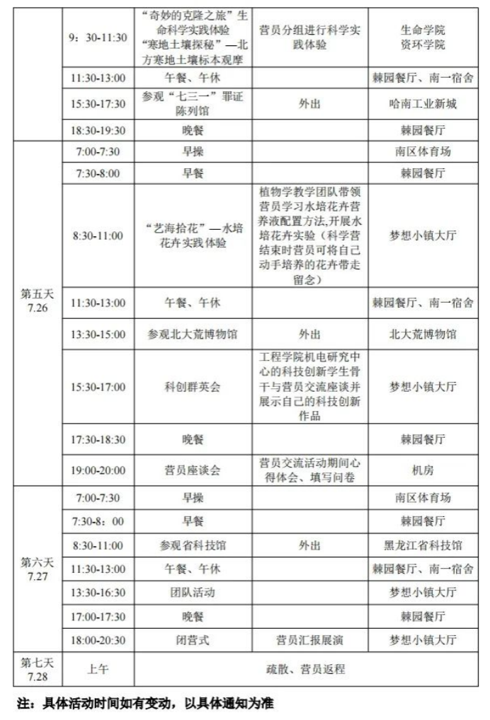 科学营活动采取校内、外活动相结合的形式,在活动内容设计上,结合东北农业大学实际情况,以符合全国高校科学营统一要求为基本原则,充分展示学校在生命科学和食品科学、农业工程机械制造、现代农业技术应用等领域的学术科研、科技创新方面的特色,充分利用学校科研教育及校园文化平台,集中体现东北农业大学文化和精神,使参加活动的学生学有所得、学有所获,培养学生科技创新的意识和基本能力,提升他们对科学的追求和对大学生活的向往。