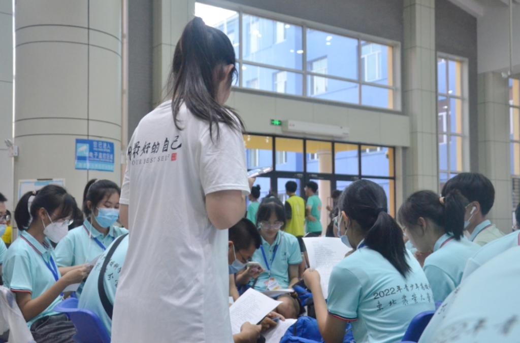 我校为全体营员配备的班级随队、后勤服务、活动保障、宣传报道志愿者与全体营员见面互动。