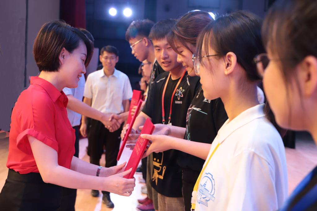 于云亮、高天琦和苗勃然为2019年全国青少年高校科学营黑龙江省分营“优秀营员”、“优秀带队教师”、“优秀志愿者”代表颁发证书。