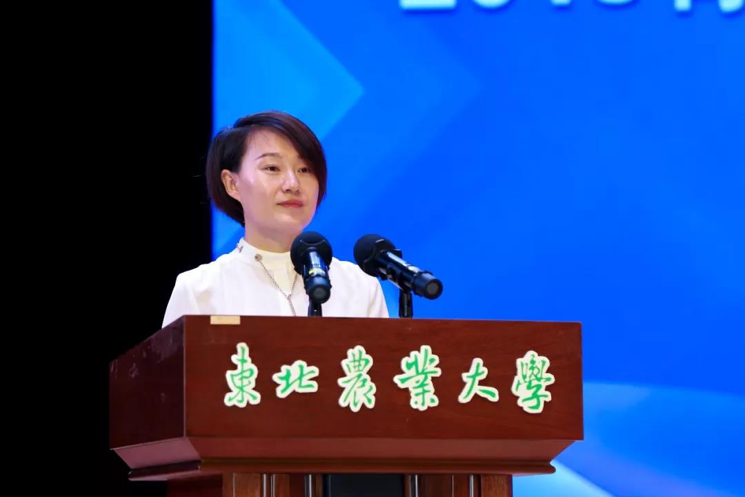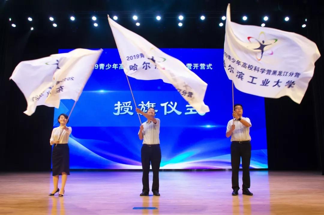 省科协党组成员、副主席臧晓敏为各高校授旗,哈尔滨工程大学团委书记史波、哈尔滨工业大学团委副书记苗勃然、我校团委副书记高天琦接受营旗。