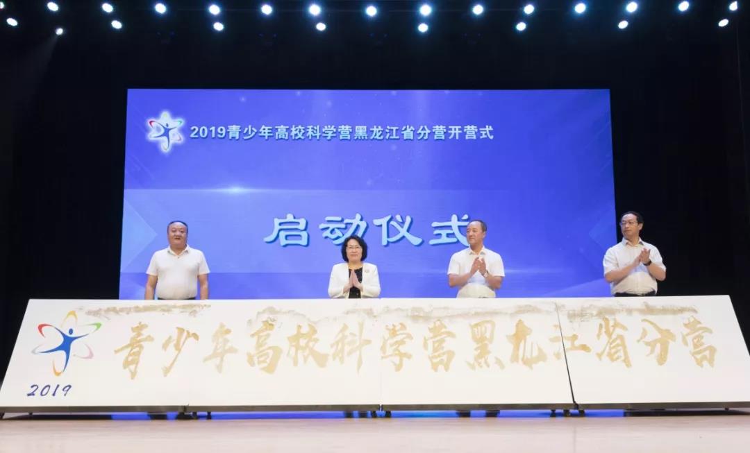 省科协党组成员、副主席臧晓敏、我校党委副书记马宏坤、省科普事业中心主任胡国庆、省教育厅基础教育二处副处长刘德宏共同倾倒金沙,缓缓呈现出“青少年高校科学营黑龙江省分营”的字样,2019青少年高校科学营黑龙江省分营正式开营。