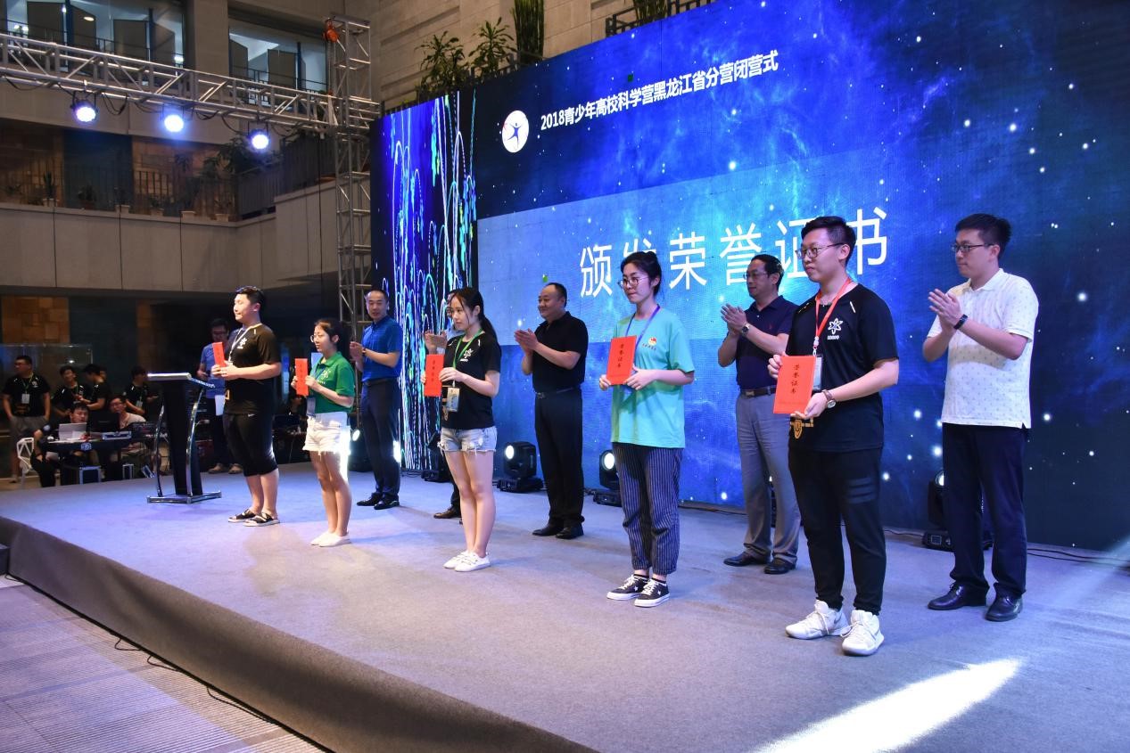 与会领导为2018年全国青少年高校科学营黑龙江省分营“优秀营员”、“优秀指导教师”、“优秀志愿者”代表颁发证书。我校优秀营员张明雪、志愿者王晓珩、带队老师侯美玲作为代表上台领奖。