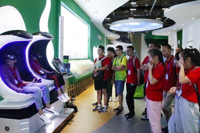 随着参观的继续,营员们来到了互动体验区和优势资源区,讲解员对之前讲解的内容进行提问,回答正确的同学可以进行VR游戏技术的体验,趣味横生的游戏调动了大家的情绪,让大家更加专注的投入到对知识的掌握中。