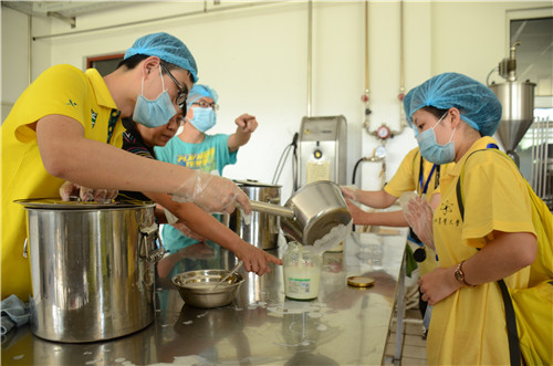 随后,营员们来到了乳品实验室进行酸奶的制作。面对现代化的实验设施和精密的仪器,营员们纷纷惊讶不已,来自通化市靖宇中学的张楠感叹:“看见这么高科技的仪器好兴奋,我仔细观察了它们,还做了笔记呢!”营员们小心谨慎的按步骤操作,取箱子、盛牛奶、接菌种。工作人员会将营员们制作的半成品送到恒温箱中发酵,六个小时之后便可以品尝自己亲手制作的酸奶了。来自嫩江县高级中学的范海双老师说:“酸奶的制作要求很高必须全程无菌,操作过程中全都要佩戴头套、医用口罩、手套,同学们连拧开盖子的时候都很小心,生怕污染了牛奶。制作饼干和酸奶,提高了学生的动手能力,体验了科学的乐趣,使青少年发自内心的热爱科学,实践科学。”