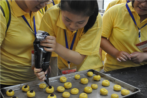 面粉、鸡蛋、黄油、专用乳原料粉、椰蓉等原料准备好之后,营员们15人一组,分别制作“椰蓉球”和“一口酥”。“焙烤最关键的就是不能放错材料,每一步材料的用量都不能有分毫的错误,手法也很重要”王师傅进行简单交代后,营员们便开始制作。称白糖、黄油,加面粉、揉面,做型,加果酱,营员们热火朝天的忙了起来。搓化黄油是营员们的一大难关,王师傅亲自示范,讲解搓黄油的技巧,同学们按照王师傅的做法,黄油渐渐发白了。有了搓黄油的经验,接下来的揉面环节便轻松了很多,营员们一面轮流揉面,一面聊天。“我在家还会包饺子呢!”“我会擀面皮!”最后,营员们刷蛋液,挤果酱,顺利完成了饼干的制作。焙烤饼干全过程都是营员们自己完成的,来自鸡西市第一中学的王译晗说:“体会到了焙烤的艰辛,原来做饼干不是那么容易!”