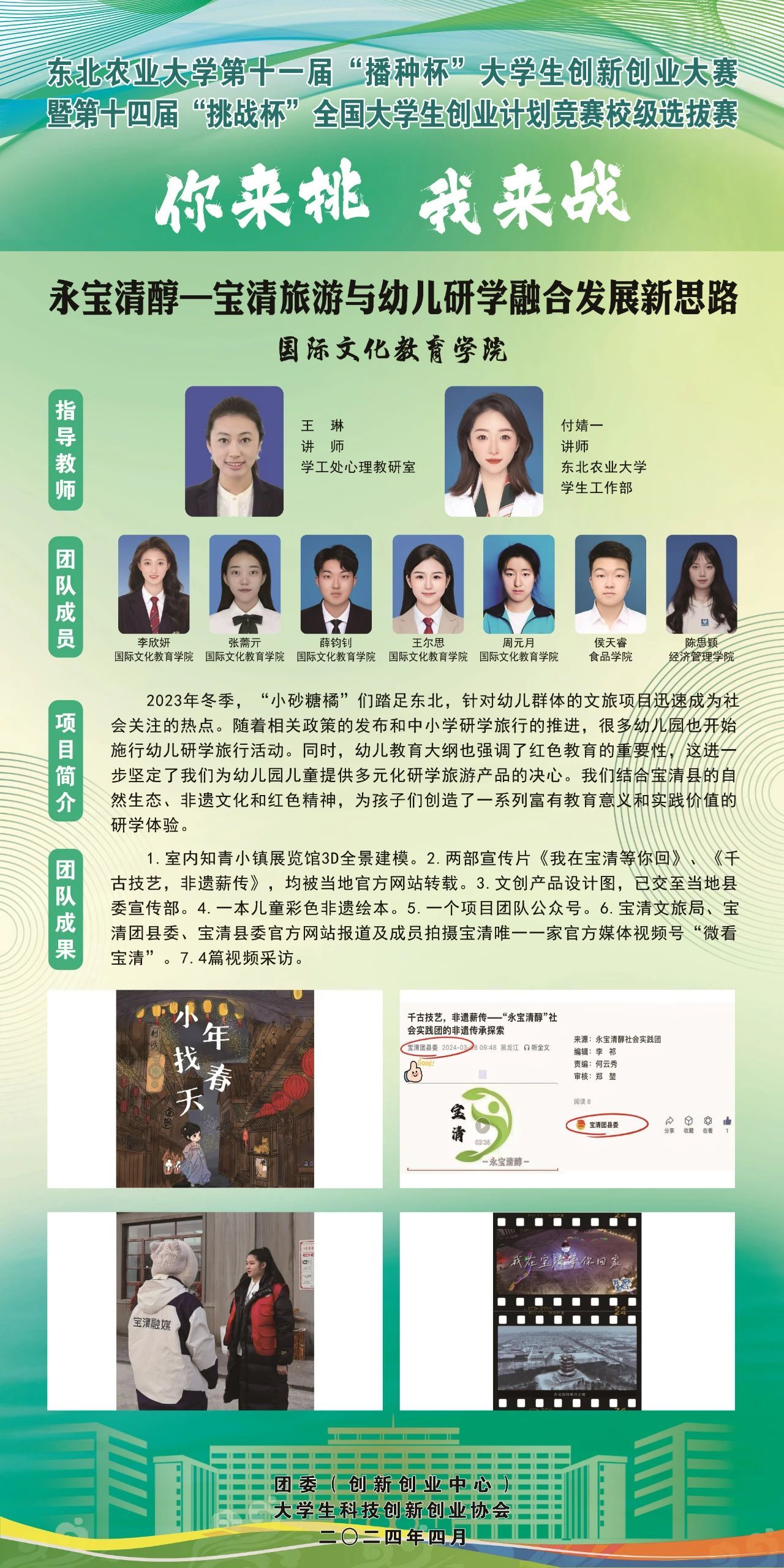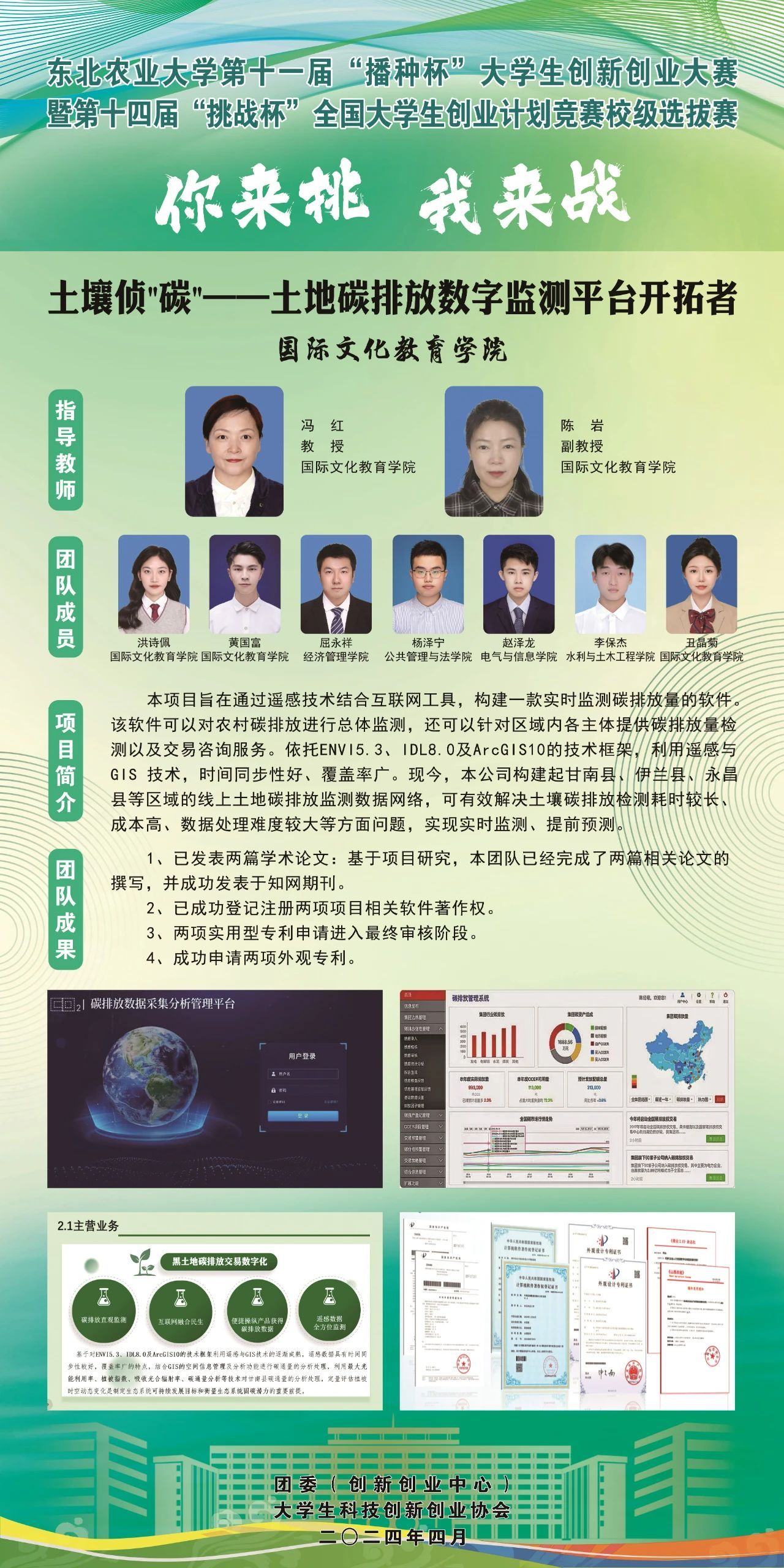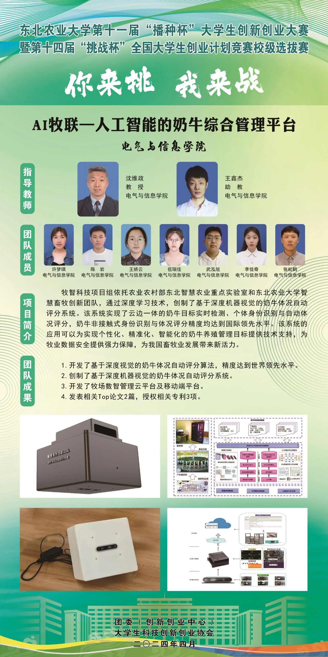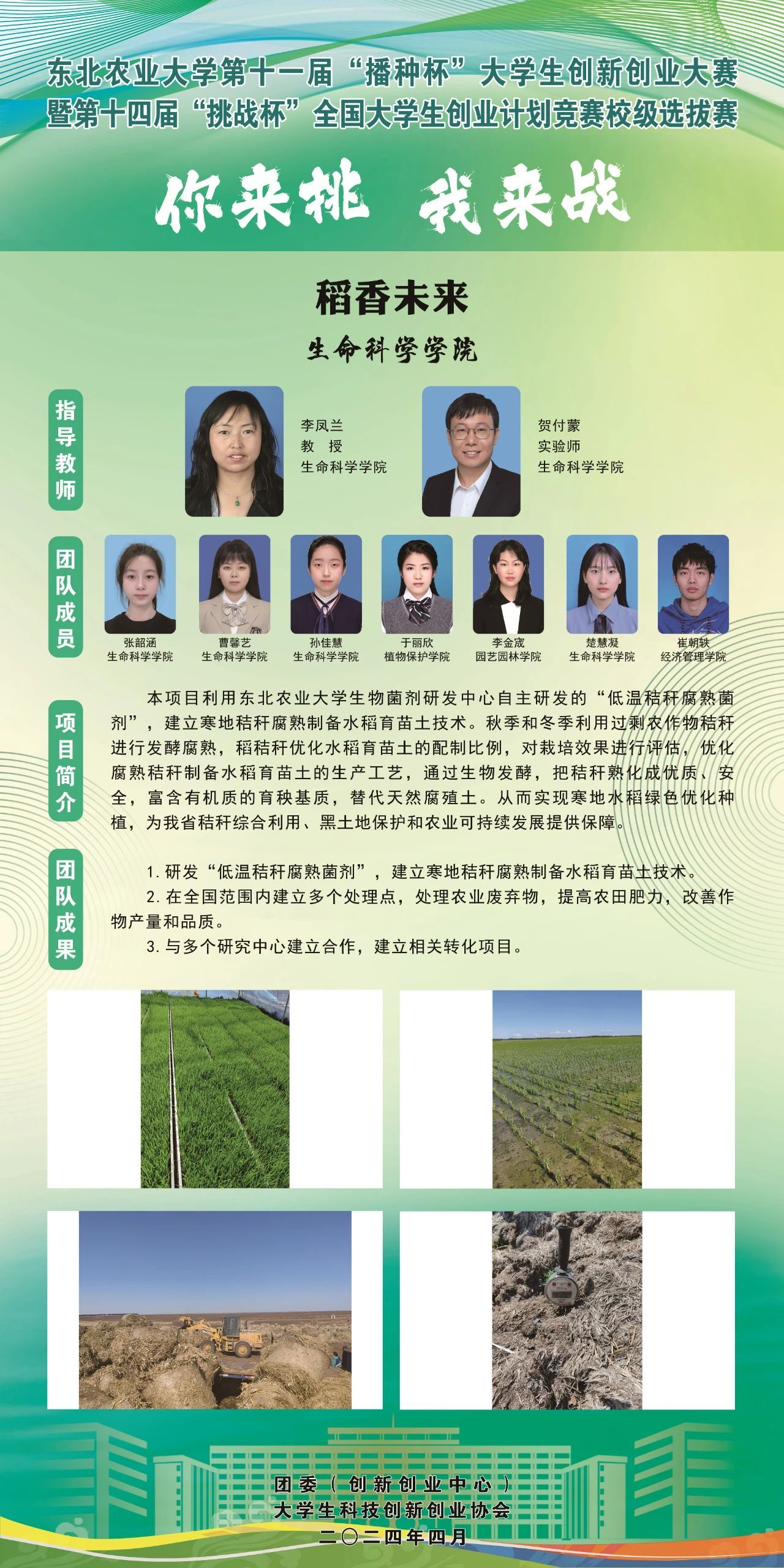 为深入学习贯彻习近平新时代中国特色社会主义思想,围绕中国式现代化建设中心任务,贯彻新发展理念、构建新发展格局、服务高质量发展,引导和激励大学生通过广泛的社会实践、深入的社会观察,不断增强对国情社情民情的了解,坚持创新引领创业、创业带动就业,落实黑龙江共青团关于服务青年“创新 创意 创业 创造”的工作要求,东北农业大学团委(创新创业中心)举办第十一届“播种杯”创新创业竞赛暨第十四届“挑战杯”大学生创新创业大赛校内选拔赛项目展示,力求进一步切实提高大学生的创新精神、创业意识和创新创业能力,助力更多优秀大学生筑梦龙江、建功龙江。