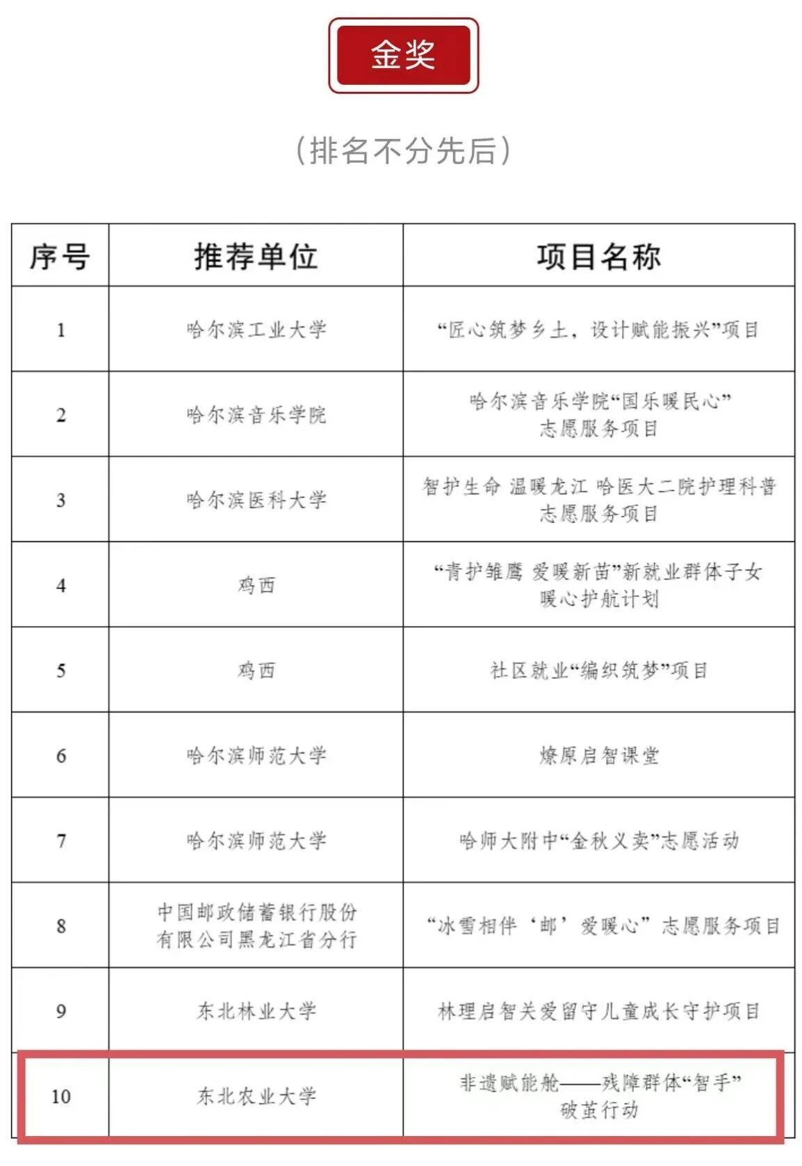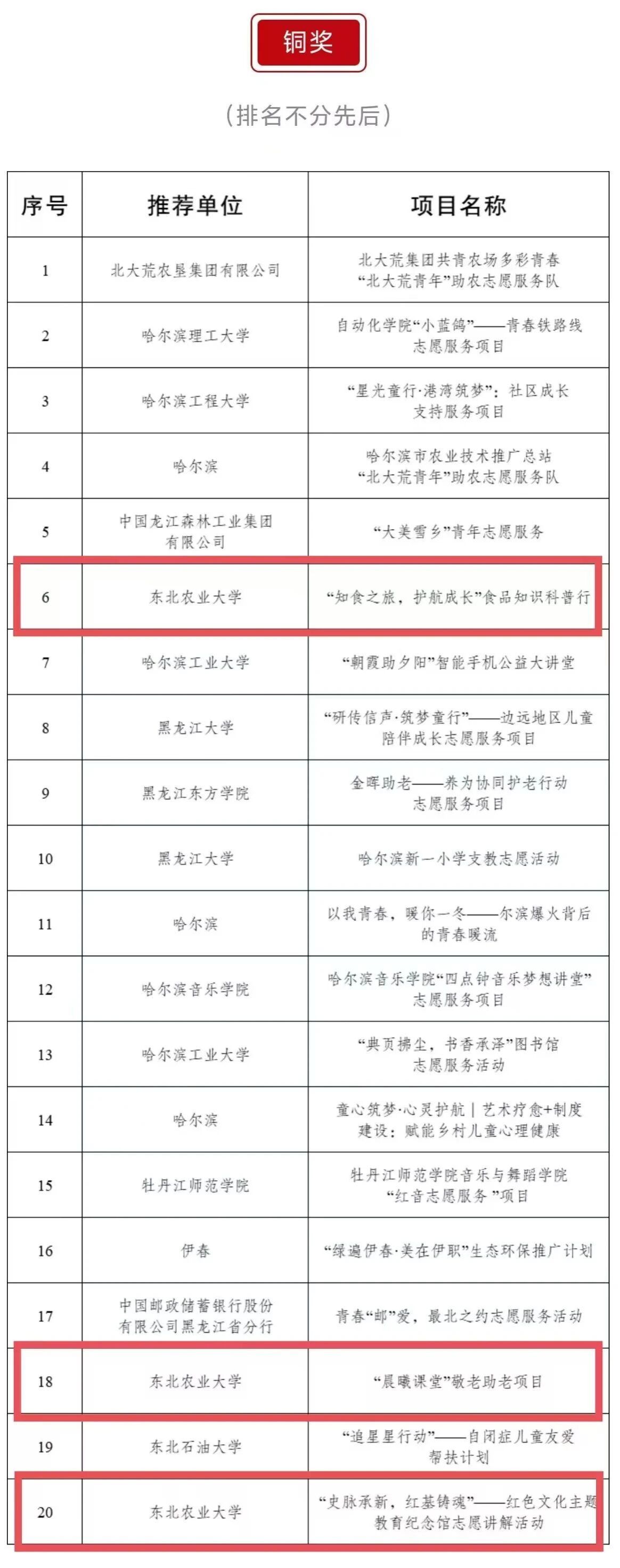 近日,由共青团黑龙江省委员会、黑龙江省青年志愿者协会主办的第八届黑龙江省青年志愿服务项目大赛暨2025年志愿服务交流会成功举办。我校志愿服务项目获得一金三铜的优异成绩,获奖总数位列全省高校第三。