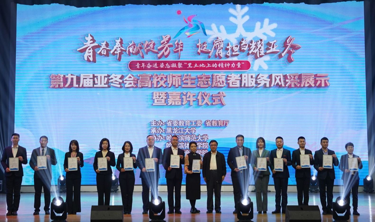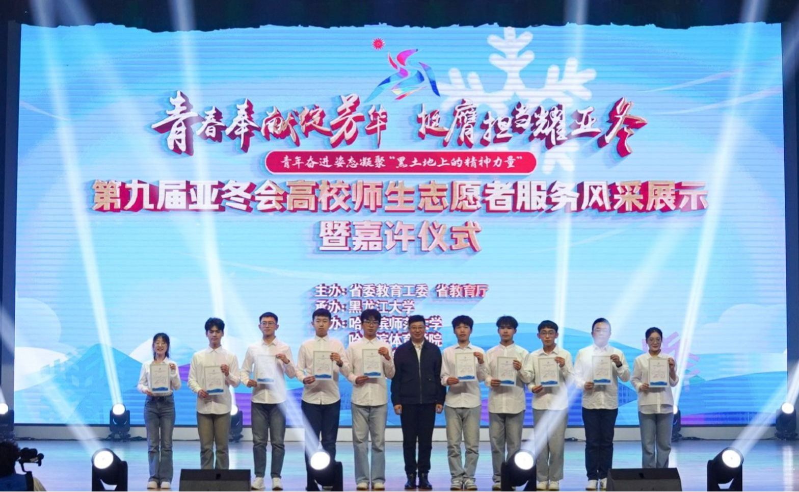 4月9日,由中共黑龙江省委教育工委、黑龙江省教育厅主办的第九届亚冬会高校师生志愿者服务风采展示暨嘉许仪式在黑龙江大学举办,我校党委副书记刘晓峰,宣传部部长王博,校团委负责同志以及我校受嘉许表扬师生参加活动。