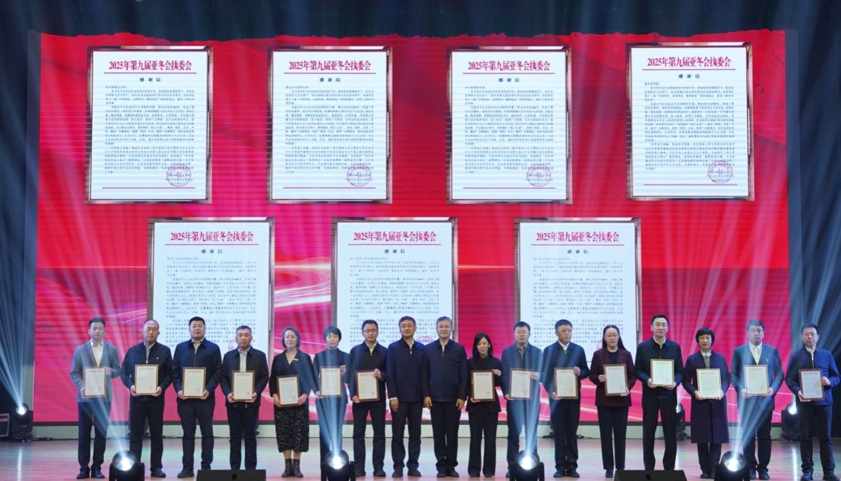 嘉许仪式上,省委教育工委副书记、省教育厅副厅长雒文虎宣读了《关于嘉许表扬亚冬会高校师生志愿者的通报》,与会领导为受嘉许表扬的师生志愿者代表颁发了证书,刘晓峰代表学校接受执委会颁发的《第九届亚冬会执委会致选派赛事侧志愿者高校的感谢信》。活动中,师生志愿者代表以情景讲述、音诗画、歌舞等形式诠释了奉献亚冬、志愿有我的使命担当,校团委组织建设科科长王琳作为教师志愿者代表参加了演出。