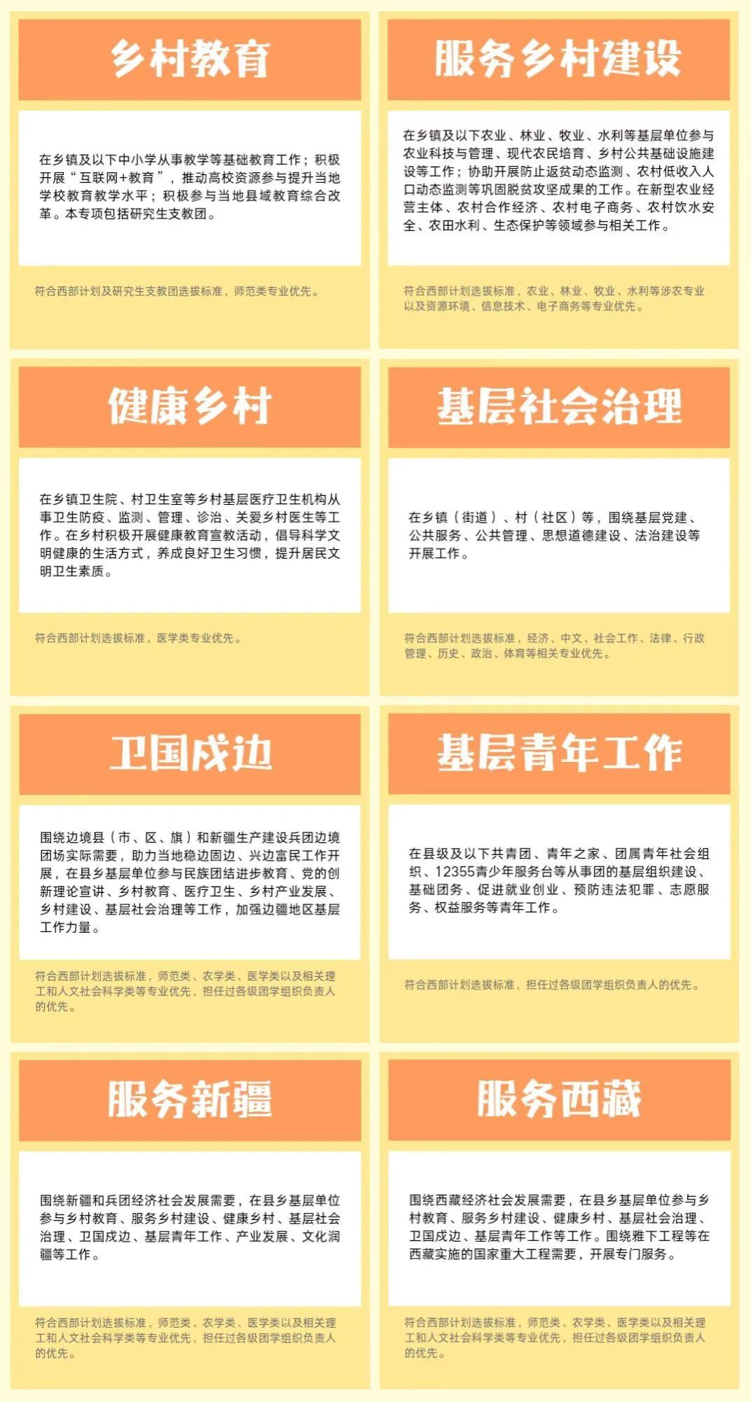 2026年西部计划项目将深入贯彻落实习近平总书记重要回信精神,引导广大高校毕业生积极参加乡村教育、服务乡村建设、健康乡村、基层社会治理、卫国戍边、基层青年工作、服务新疆、服务西藏等8个专项,以青春力量服务国家战略、服务百姓民生、服务社会治理。今年全国预计新招募约6人,新疆、西藏等27个省(自治区、直辖市)和新疆生产建设兵团的基层一线开展志愿服务,90%以上服务岗位在乡镇及以下。西部计划志愿者服务期为1至3年,服务协议一年一签。为激励志愿者服务期满继续扎根西部、扎根基层,国家在升学、就业、培养等多个方面给予政策支持。