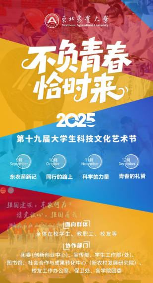 东北农业大学大学生科技文化艺术节是传承十余载的校园文化经典品牌,已举办18届(2011年),是学校“大思政”育人格局的重要组成部分,是东农学子展示青春风采、繁荣校园文化、参与学校建设、凝聚奋进力量的重要育人载体。为推动校园文化活动有序传承,实现“经典品牌不断代、参与认知不断层”,与新兴活动载体有效融通,精心打造“东小农”系列校园文化品牌,校团委(创新创业中心)决定重启该项品牌活动,举办第十九届大学生科技文化艺术节,聚焦广大同学学习、生活、社交、实践、精神成长等需求,坚持以“育人为本、高雅不凡”的活动内涵和“更人文、更先进、更自在”的育人场域,引领东农学子在思想引领、专业学习、社会调查、创新实践等系列校园文化活动中培养“育人品性、学术品貌、文化品味”,努力成长为明辨笃行、守正创新的新时代东农人。